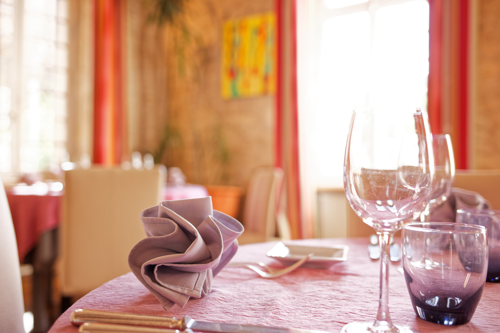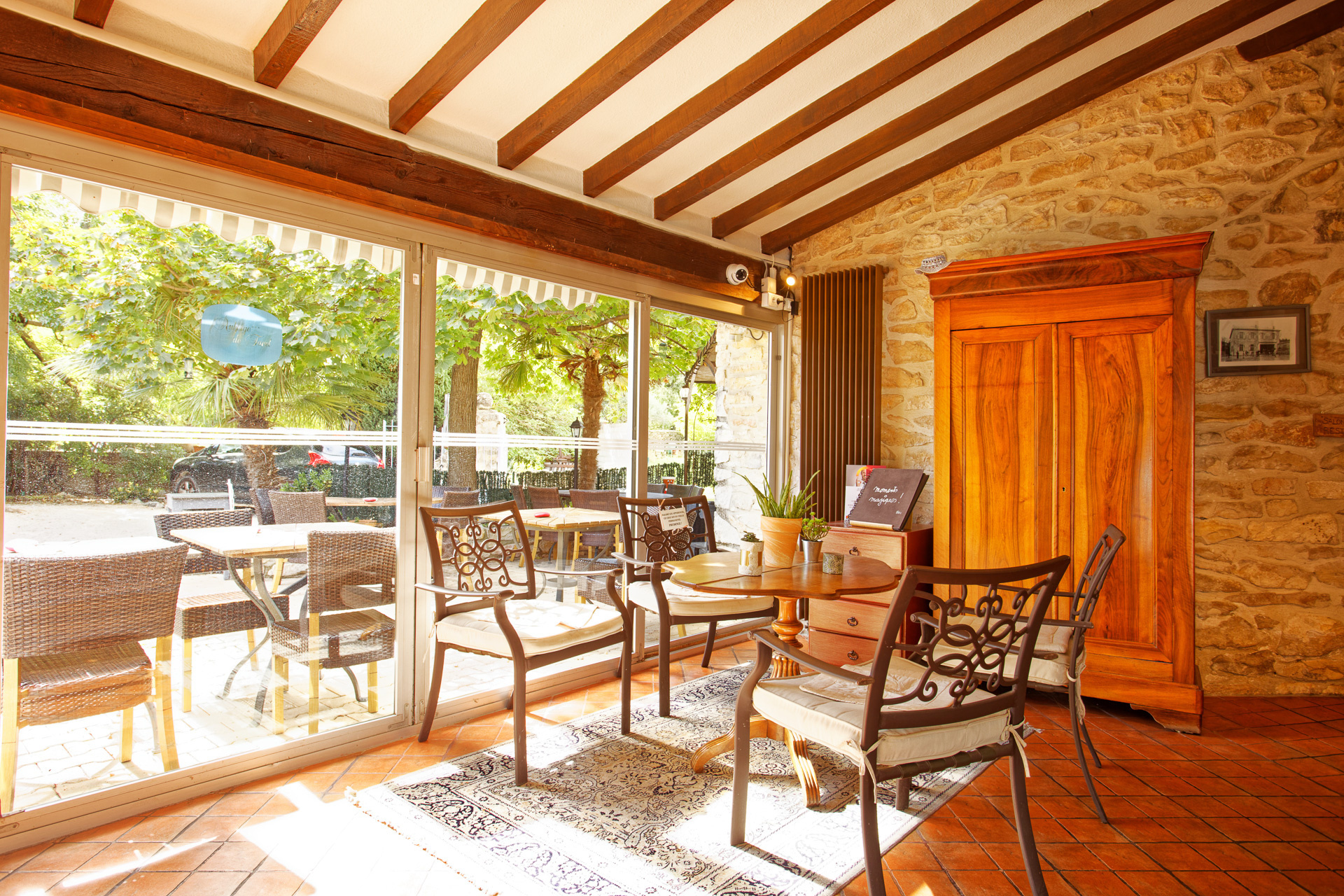 Le restaurant d'une capacité de 26 couverts (pouvant être monté à 39 facillement) et 55 places en configuration groupe, possède également une terrasse ombragée pouvant accueillir en saison entre 26 et 38 couverts.