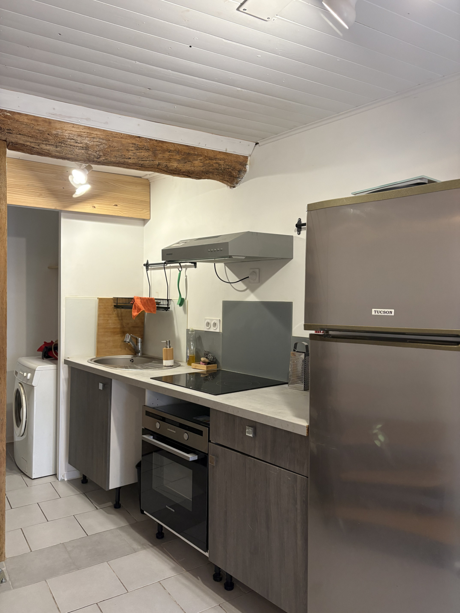 Entrée dans pièce de vie, cuisine ouverte et buanderie avec WC,