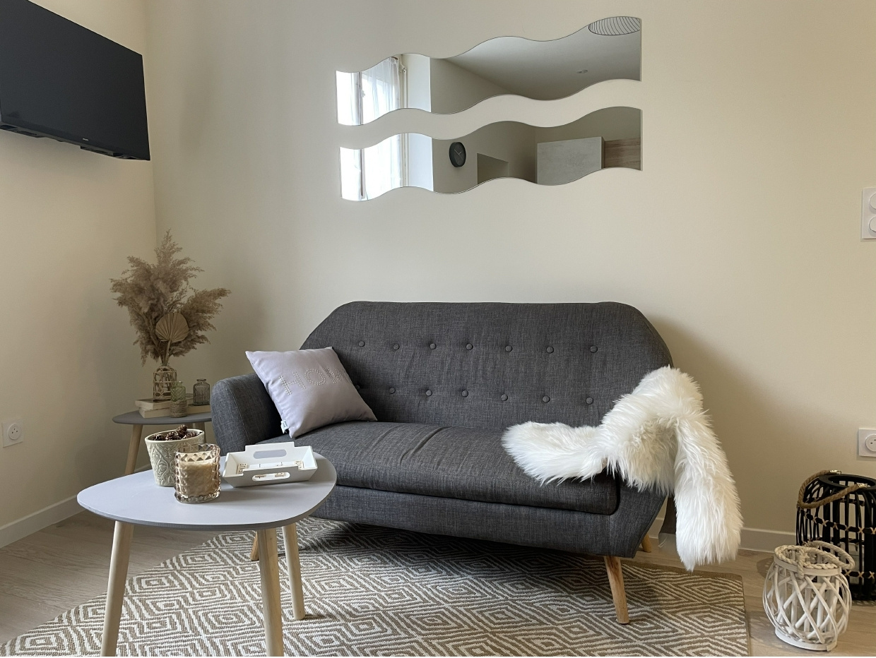 Salon possédant un canapé, table basse, télévision.