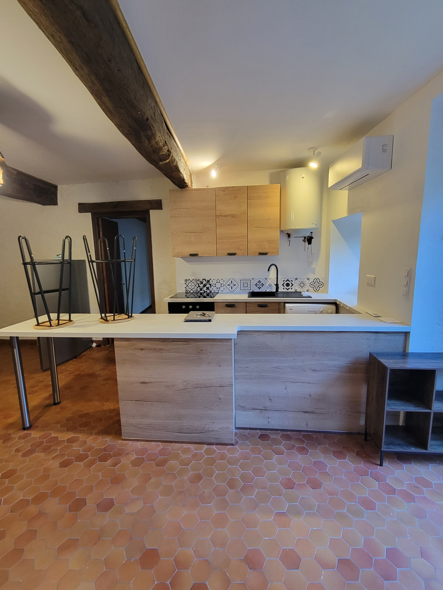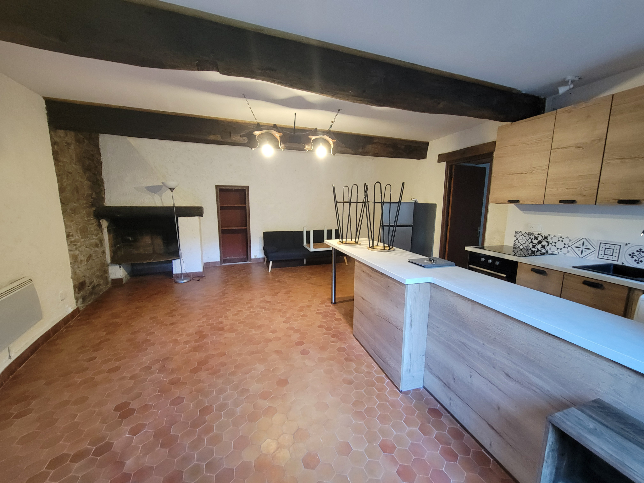Comprenant un lit avec matelas neuf, un clic-clac, une table basse, un petit meuble, un réfrigérateur neuf, un four, une plaque et des tabourets.