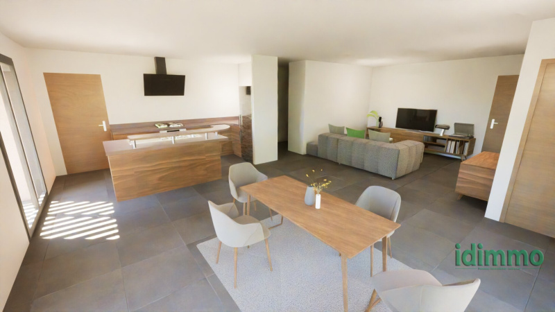 Le séjour et la cuisine ouvrent sur une vaste terrasse longeant l'ensemble de l'habitation. La terrasse offre un point de vue avancé sur le soleil couchant, avec vue dégagée.