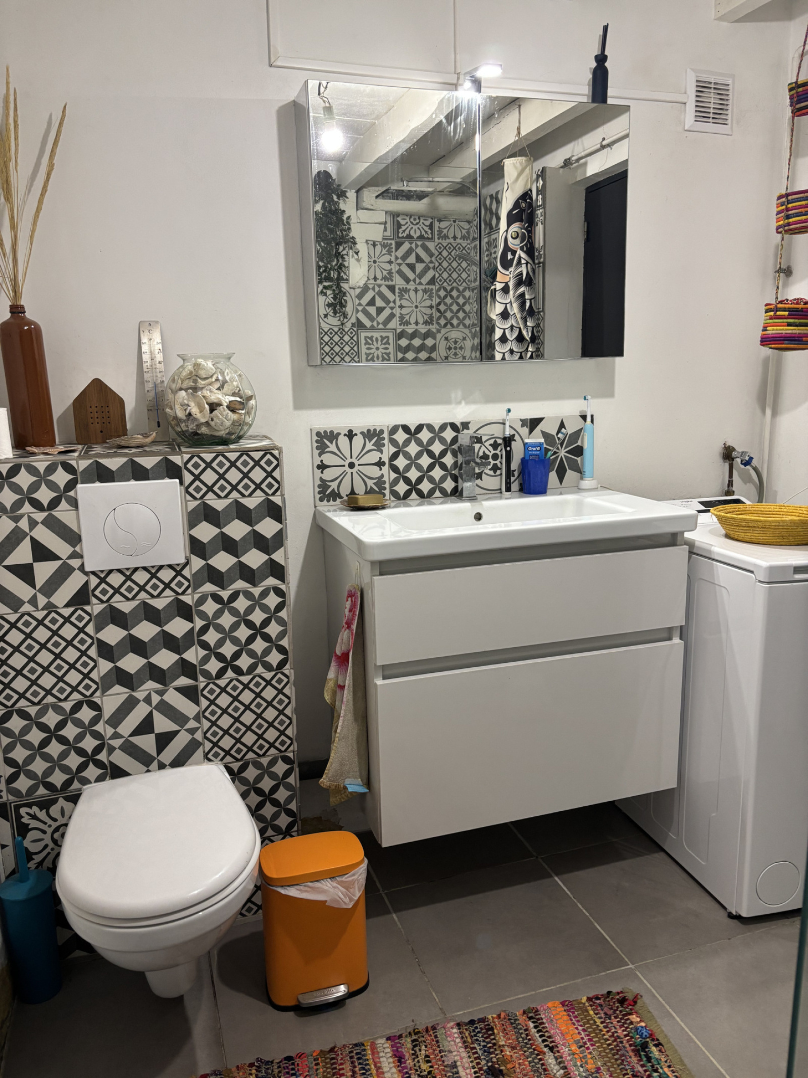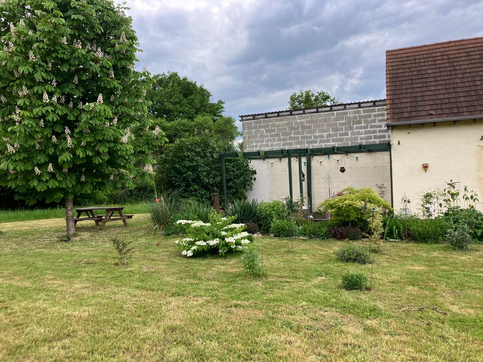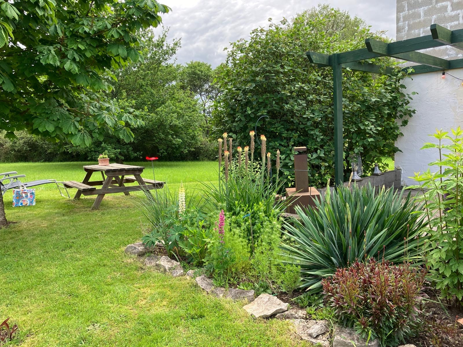 Une terrasse en béton est présente à l'avant et à l'arrière de la maison. À l'arrière, un coin extérieur confortable a été aménagé avec vue sur le grand jardin.