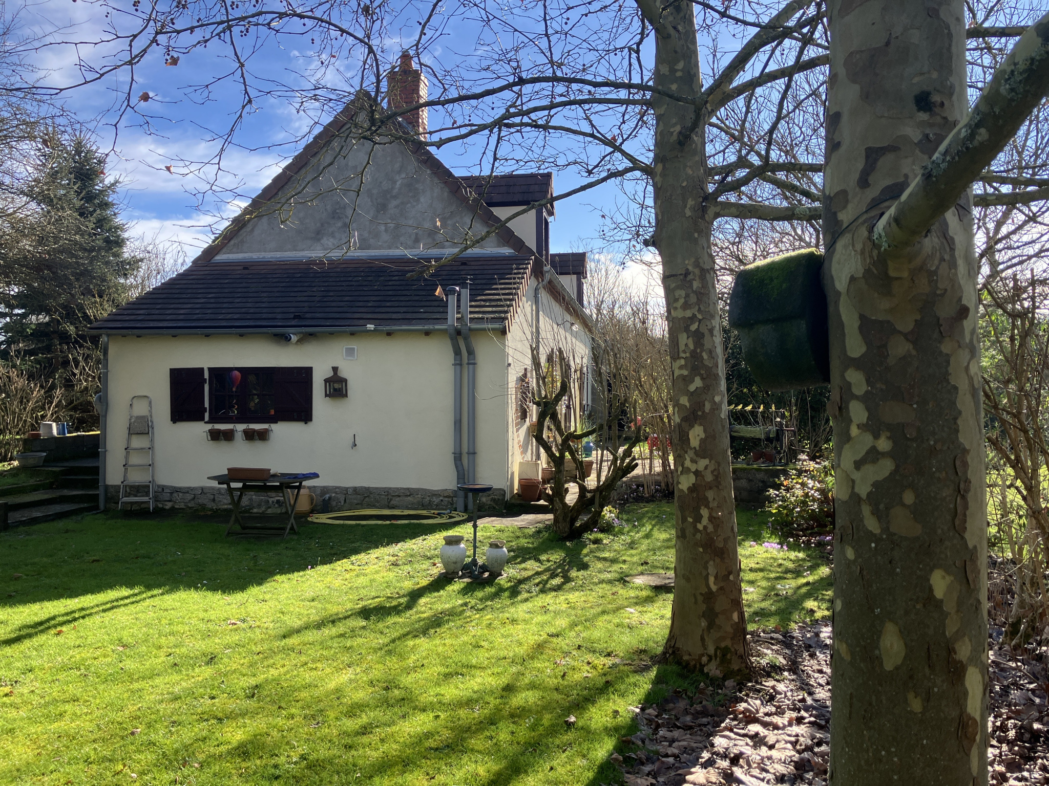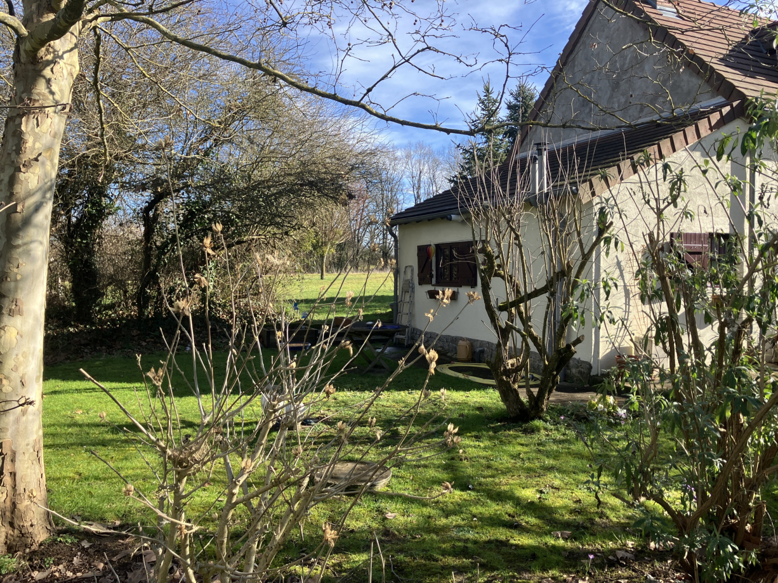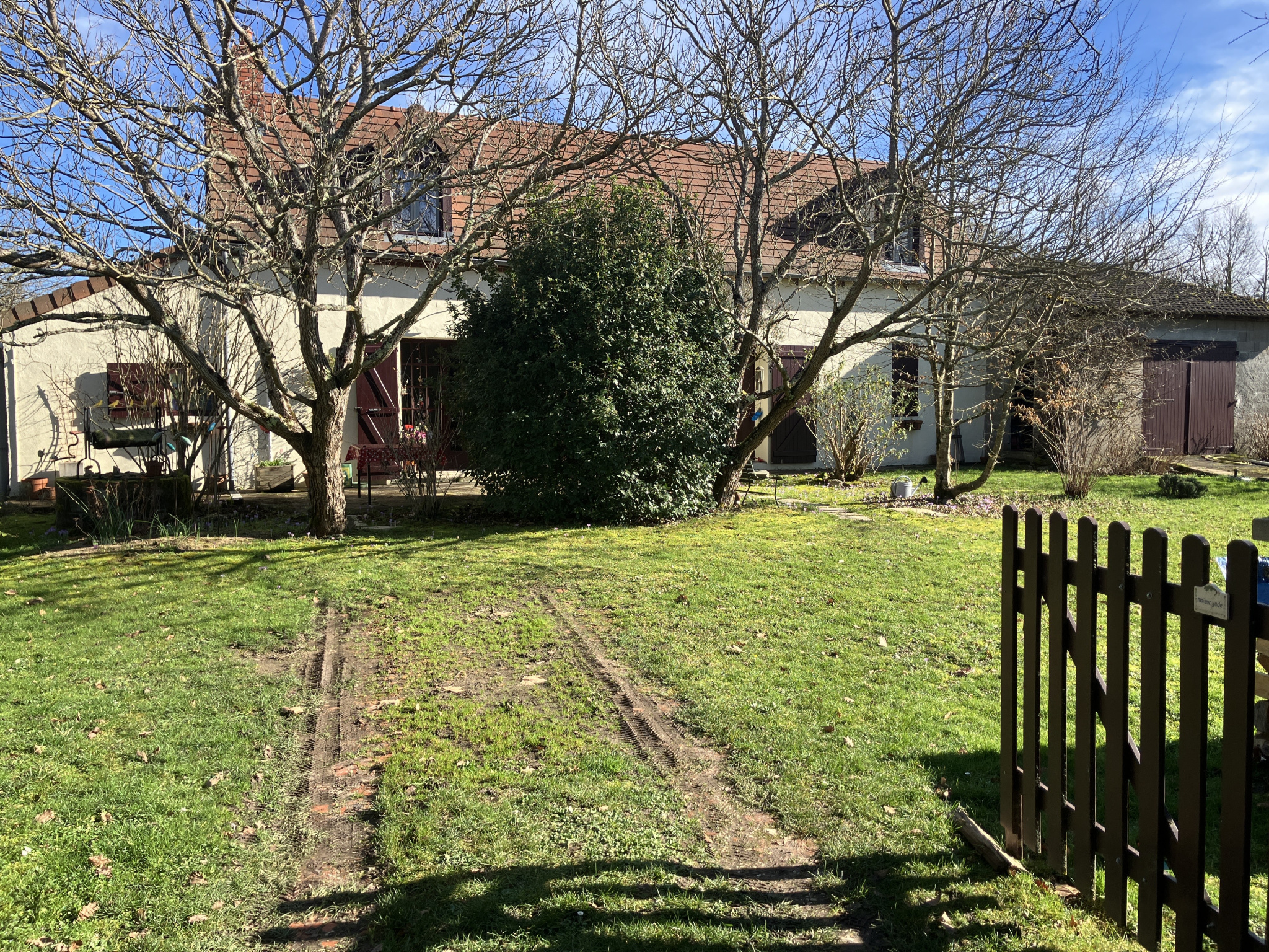 La surface habitable totale de la maison est d'environ 115 m². La maison dispose d'un toit en bon état, les fenêtres sont en partie équipées de simple vitrage et en partie de double vitrage. Il y a un garage d'environ 27 m² qui sert actuellement à stocker du matériel de jardinage et du bois, et dans le jardin à l'avant se trouve un puits. L'ensemble est situé sur un terrain de 8268 m².