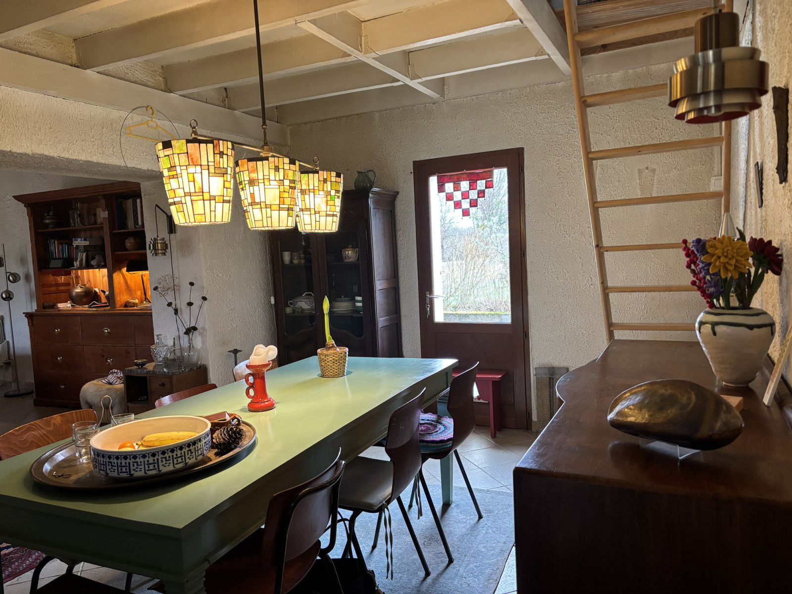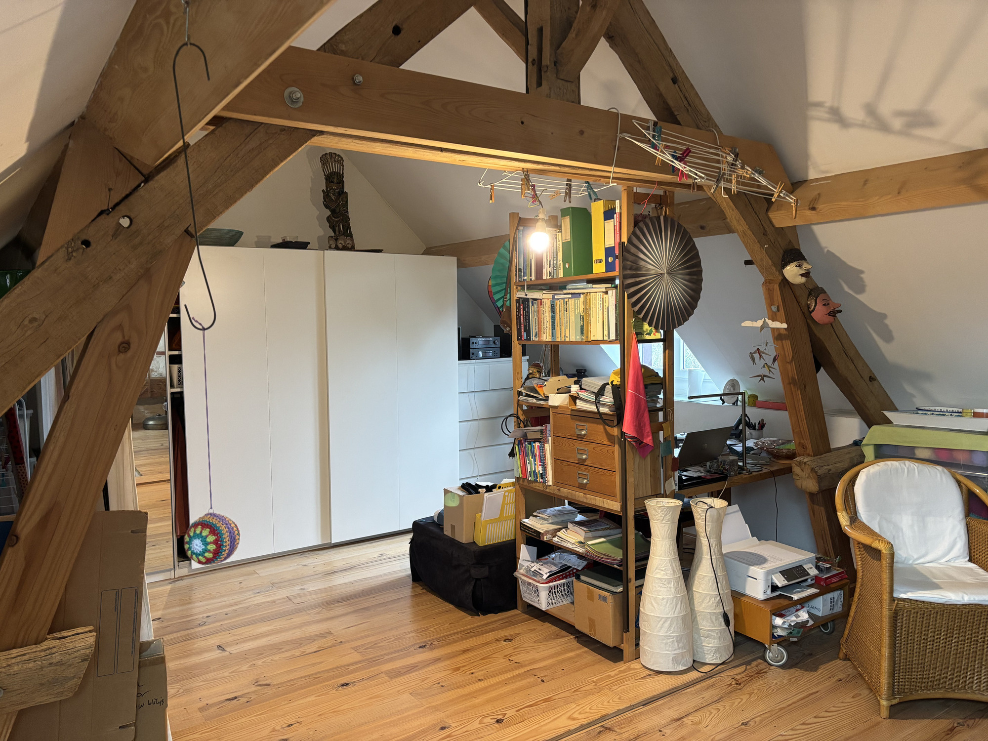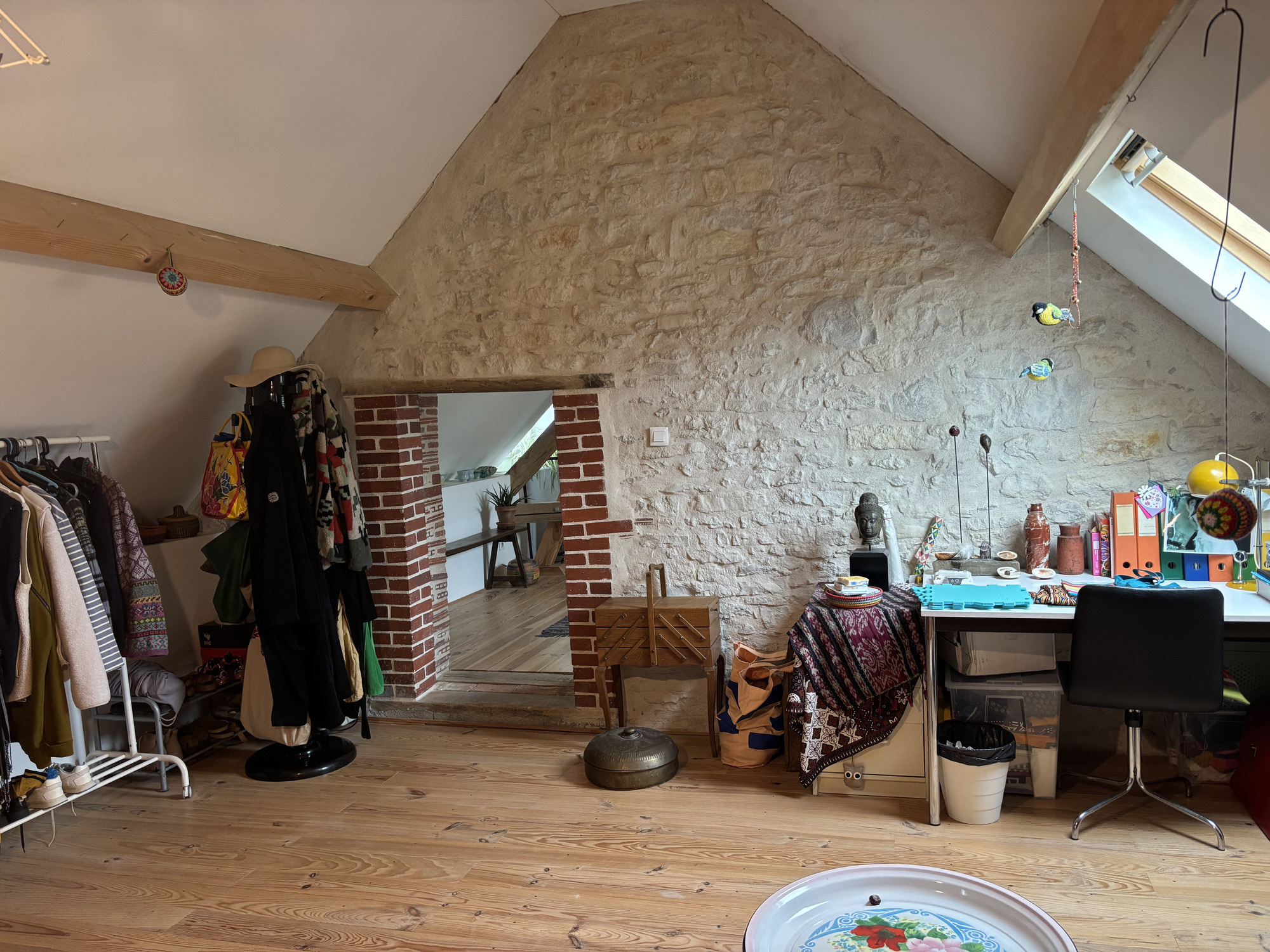 L'escalier de meunier dans la salle à manger mène à l'étage supérieur, où se trouve une grande pièce ouverte avec un mur en pierre, un coin bureau, des placards, un radiateur et une lucarne. Cette pièce donne accès à la deuxième chambre, très spacieuse et lumineuse, qui dispose également d'un radiateur et d'une lucarne.