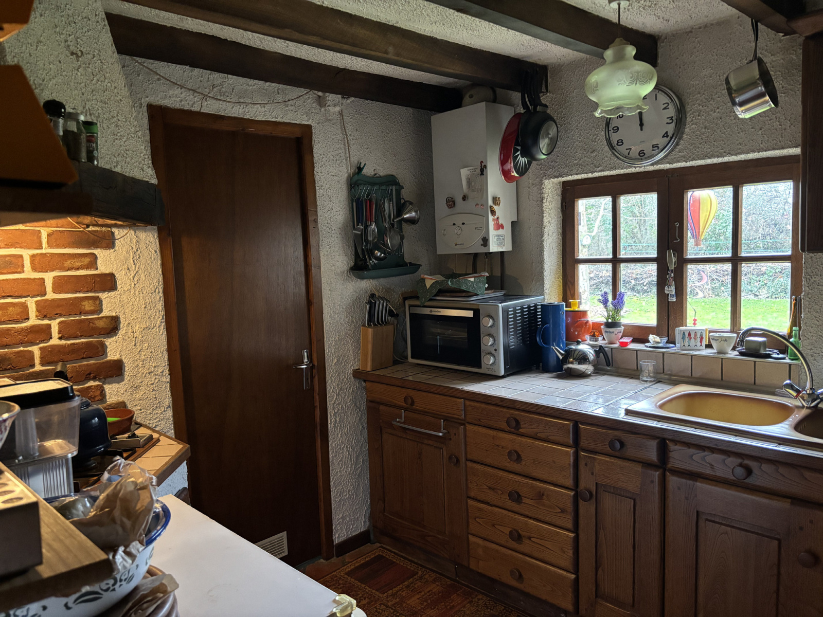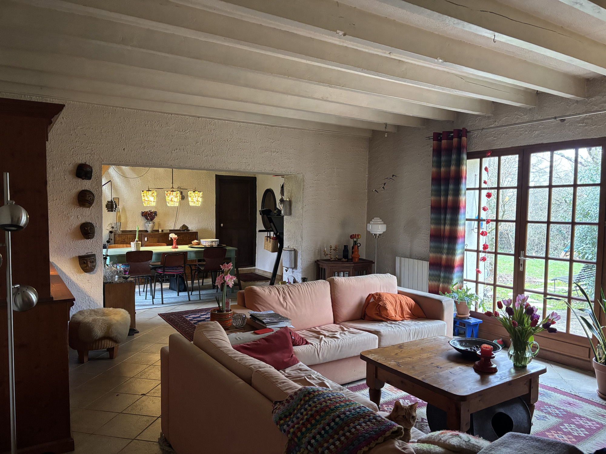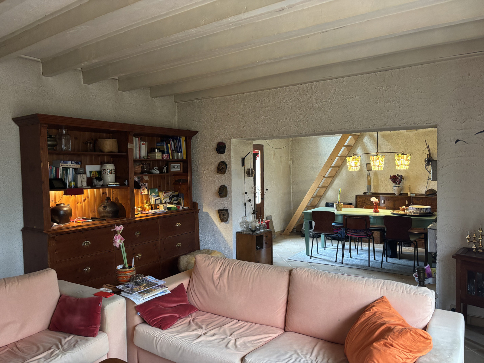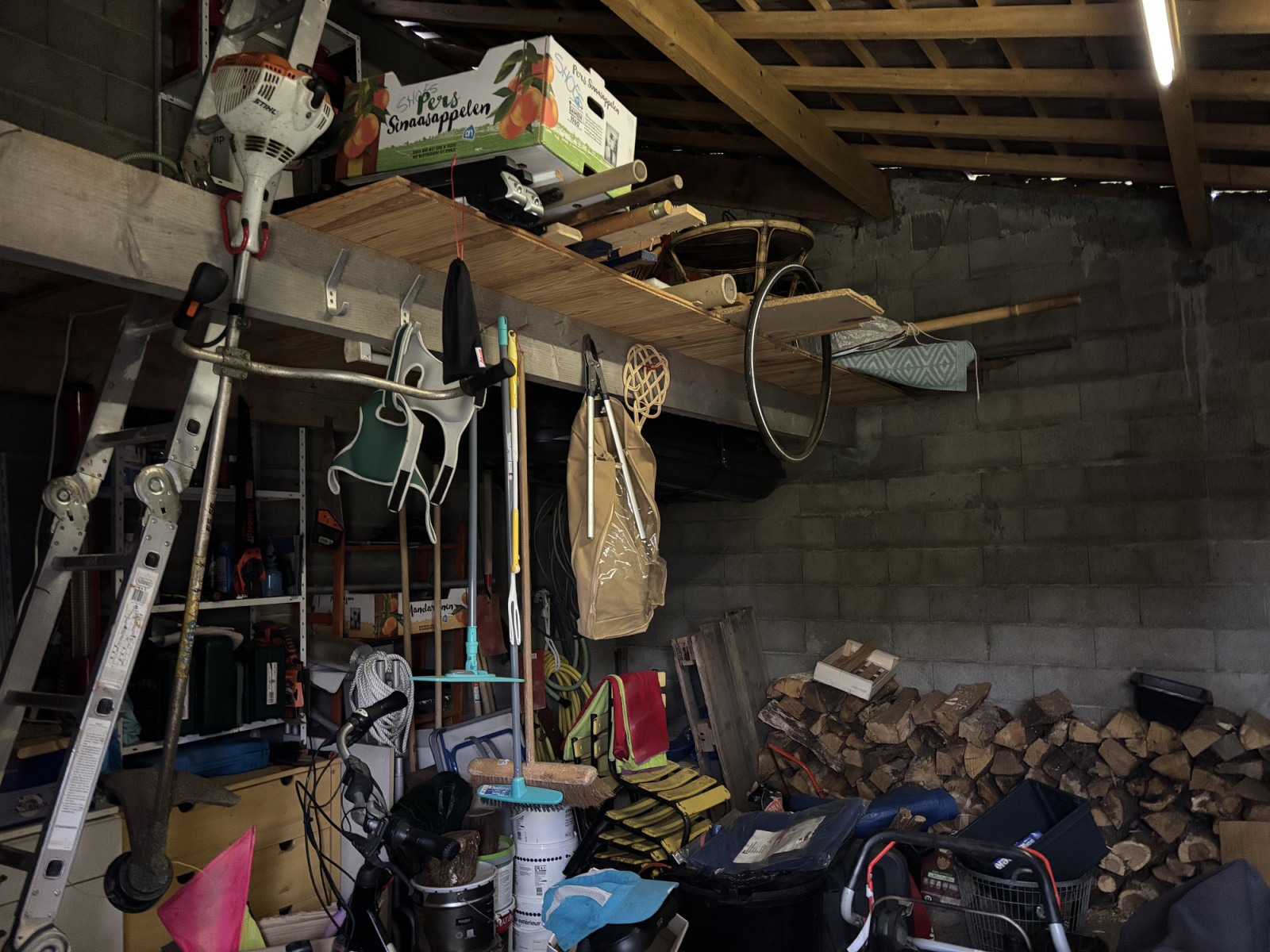 L'escalier de meunier dans la salle à manger mène à l'étage supérieur, où se trouve une grande pièce ouverte avec un mur en pierre, un coin bureau, des placards, un radiateur et une lucarne. Cette pièce donne accès à la deuxième chambre, très spacieuse et lumineuse, qui dispose également d'un radiateur et d'une lucarne.