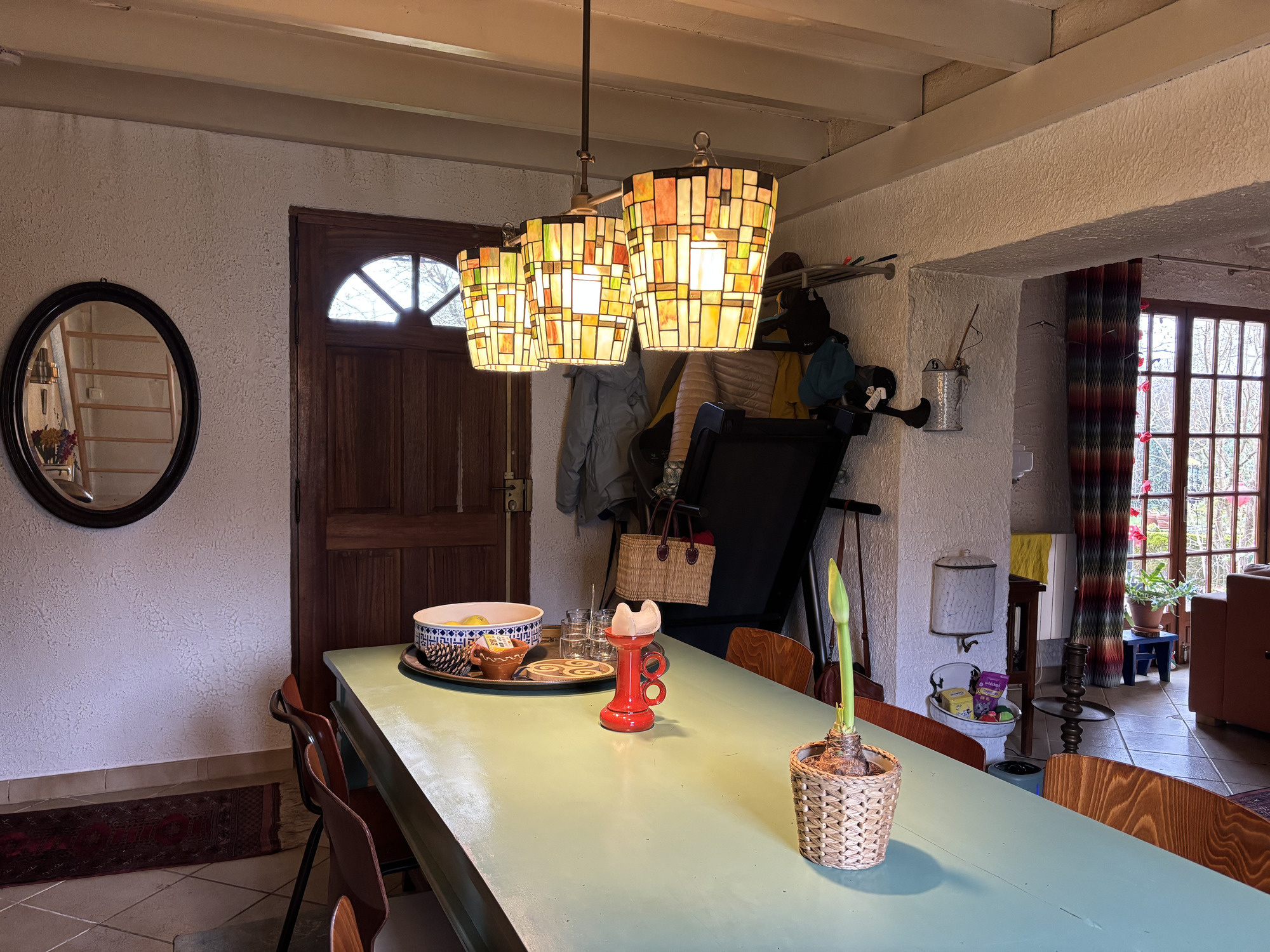 La maison est accessible par la porte d'entrée qui donne sur la salle à manger, où se trouvent également une porte menant à l'arrière de la maison et l'escalier menant à l'étage supérieur. À gauche de la salle à manger, une grande ouverture mène au salon. Celui-ci est équipé de grandes portes-fenêtres donnant sur le jardin avant, d'un poêle à bois et de deux radiateurs électriques. Depuis le salon, un passage mène à la cuisine, équipée de quatre feux à gaz et d'un sol en anciennes tomettes. Depuis la cuisine, une porte mène à la salle d’eau, équipée d'un lavabo, de toilettes, d'un radiateur sèche-serviettes, d'une grande douche à l'italienne et d'un raccordement pour une machine à laver.