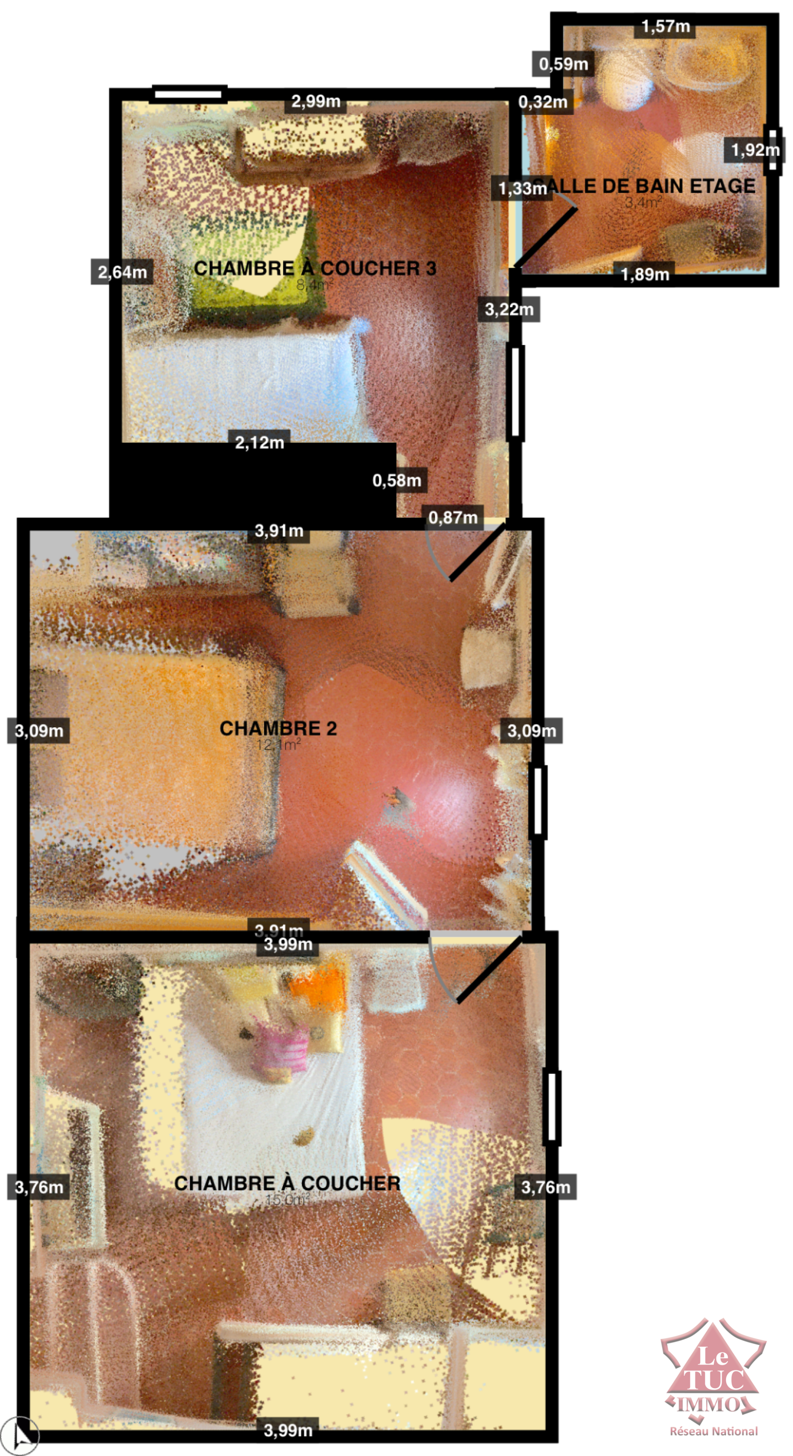 A l'étage trois chambres, salle de bains et toilettes, deux belles caves. Belle terrasse sur vue + jardinet privatif de 70 m2 environ.