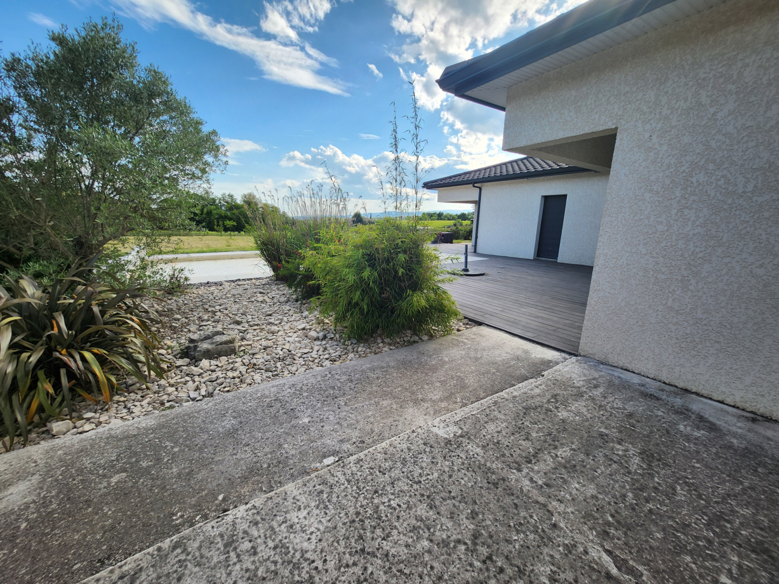 *** Conception bioclimatique avec une casquette : orienté Sud. Le soleil bas de l’hiver rentre dans le séjour dès le matin par la baie vitrée de la terrasse tant qu’en été le soleil plus haut ne rentre pas ***