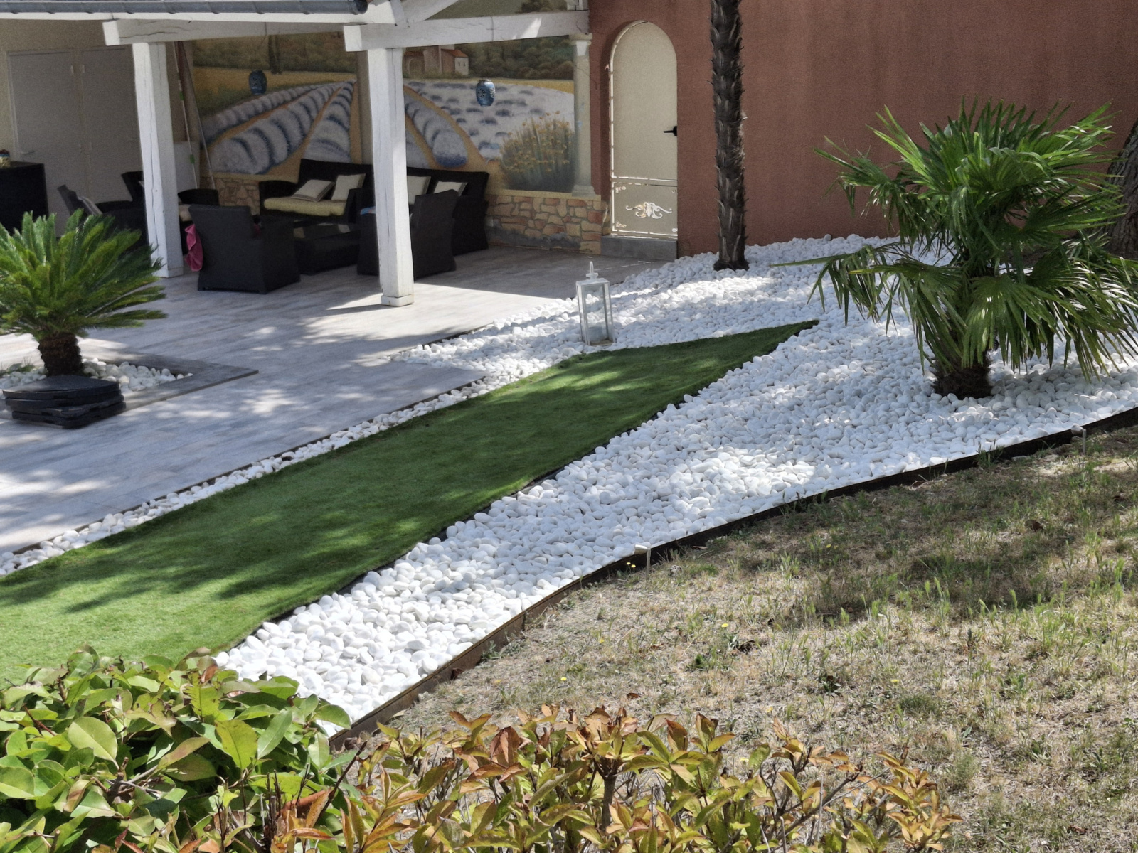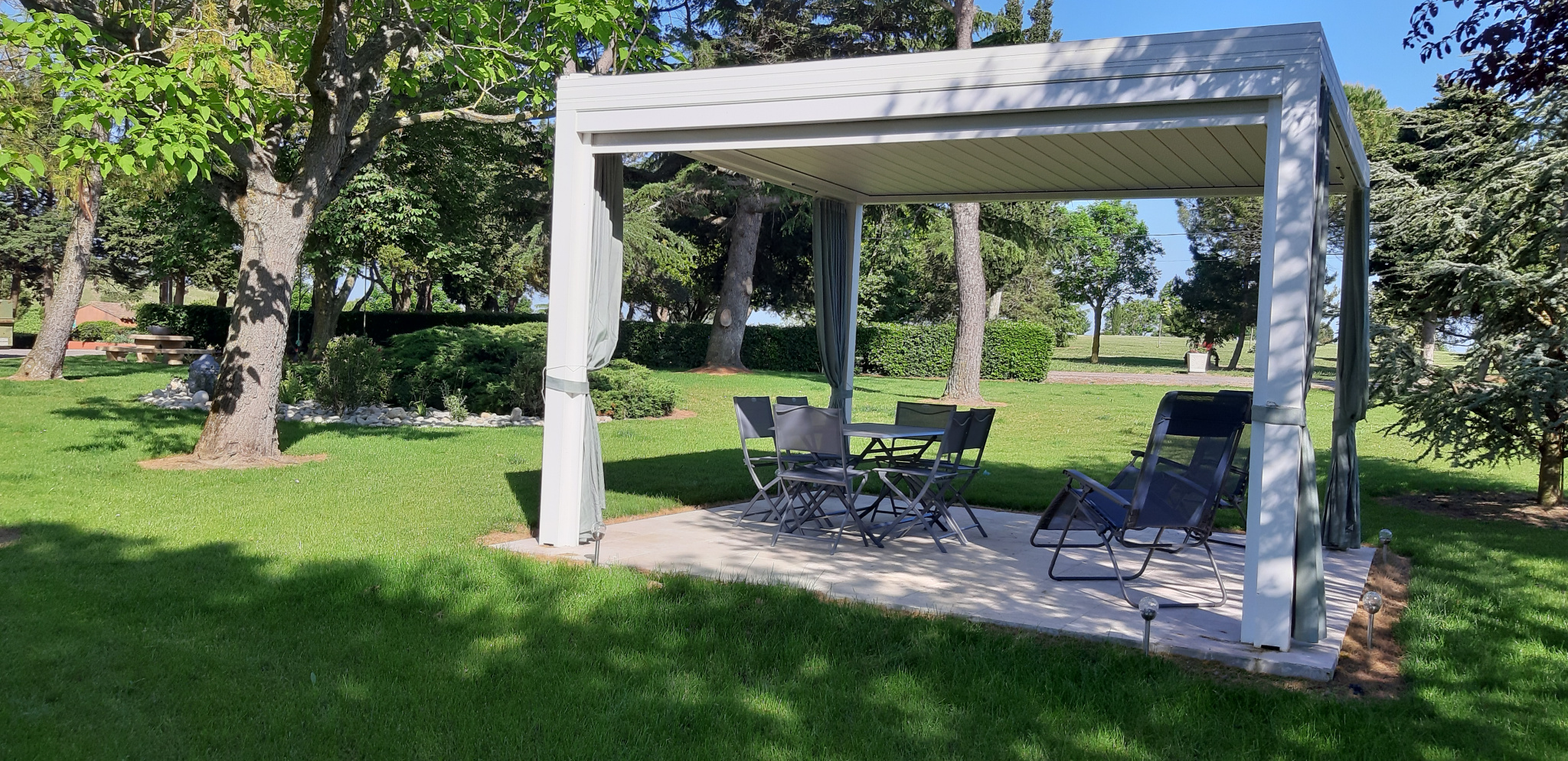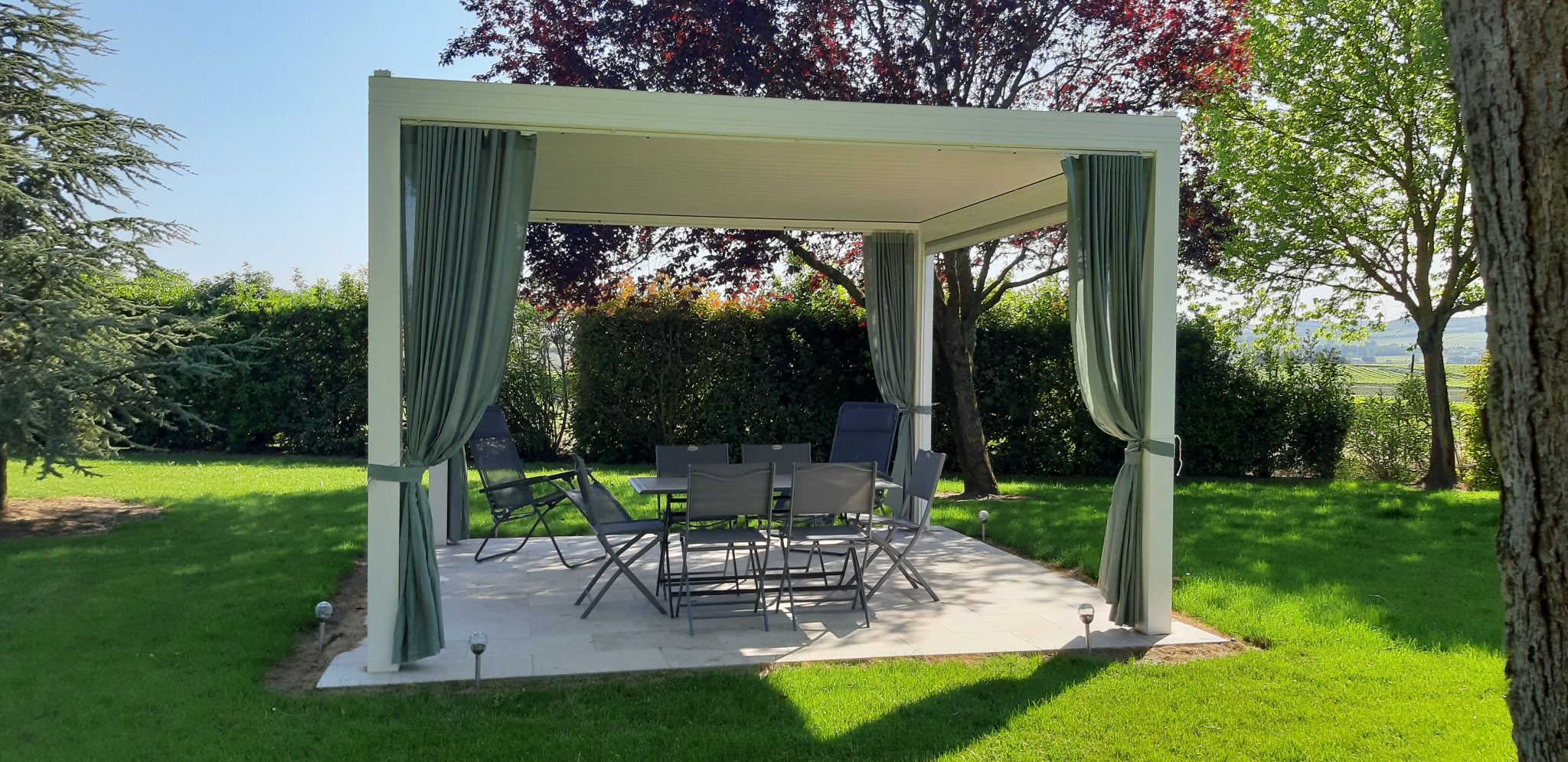 Véranda-Cuisine d\'étécharpente apparente, grand barbecue, bar, baie en alu, dalles de bavière grise au sol