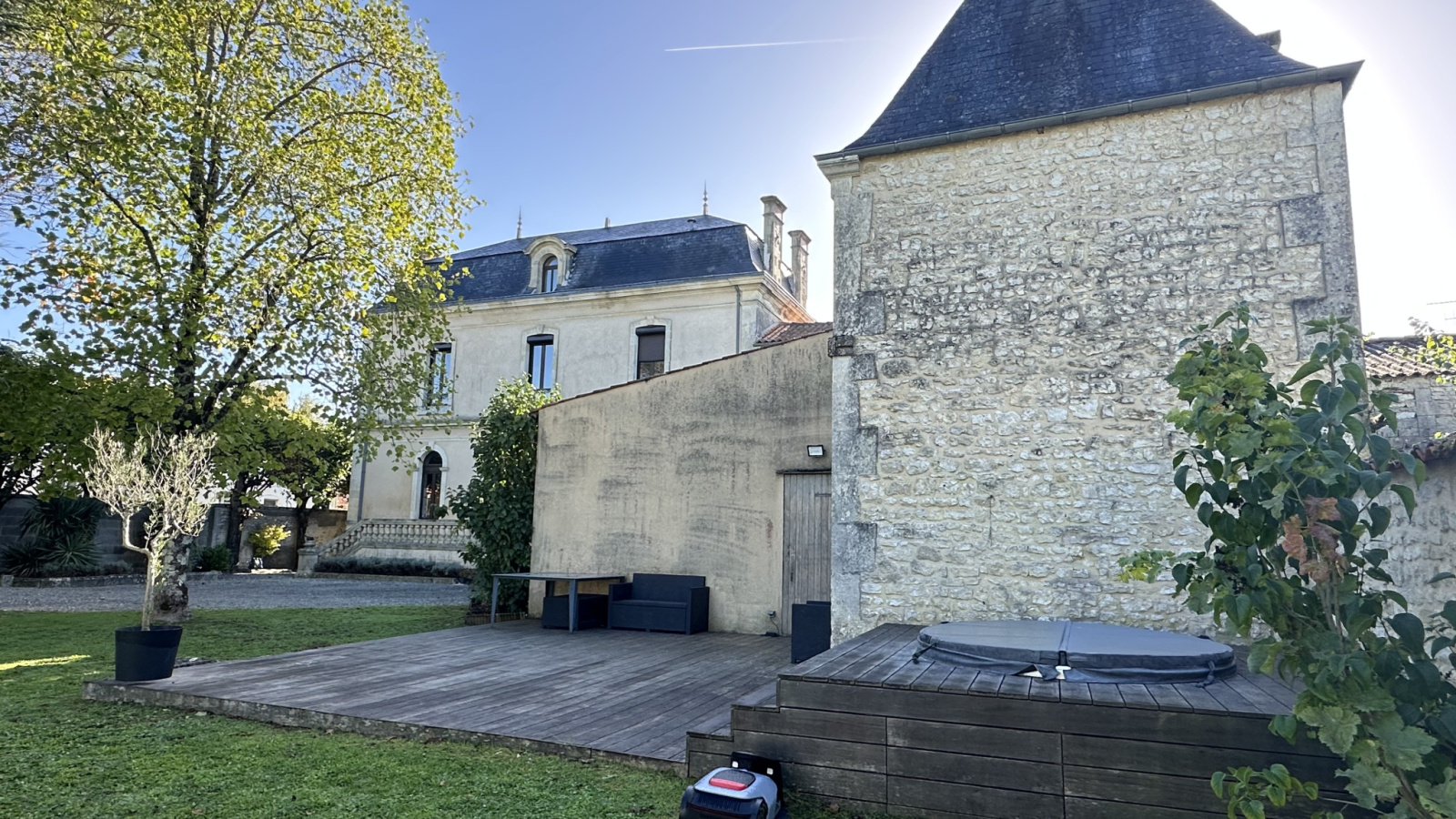 Outside, there's a beautiful reception garden at the front, and a garden of approximately 2,000 m² at the rear with a large 70 m² garage and a 39 m² room/cinema/leisure area.