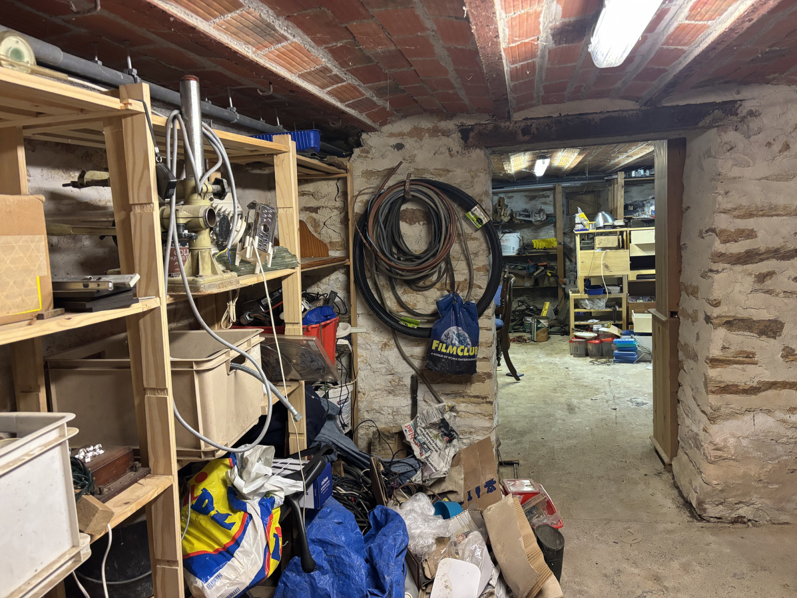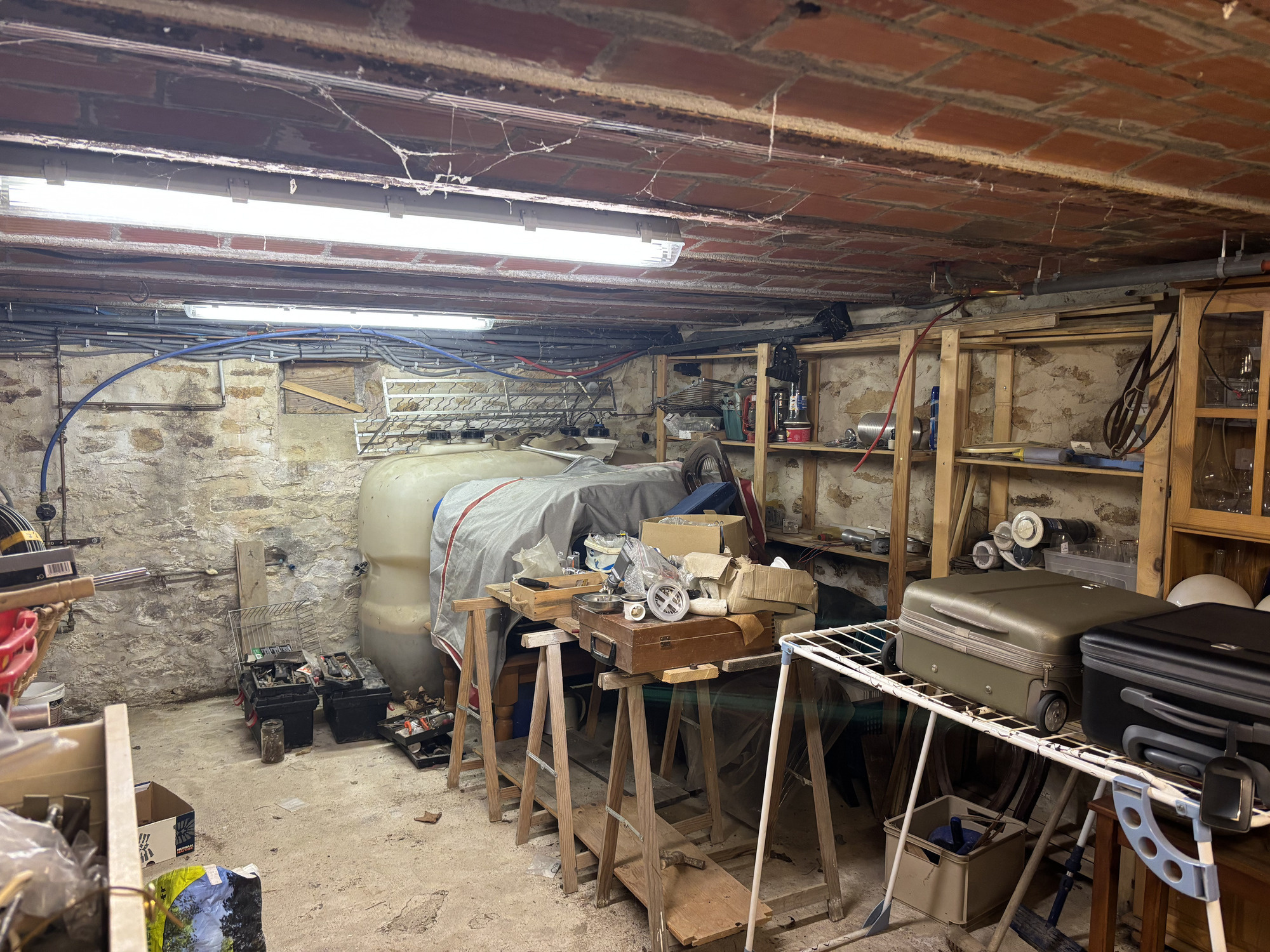 La dernière porte donne accès à une cave spacieuse où se trouvent les branchements pour la machine à laver et le sèche-linge, ainsi que le chauffe-eau, la chaudière au fioul, la cuve de fioul et de nombreux espaces de rangement, car la cave s'étend sous toute la maison.