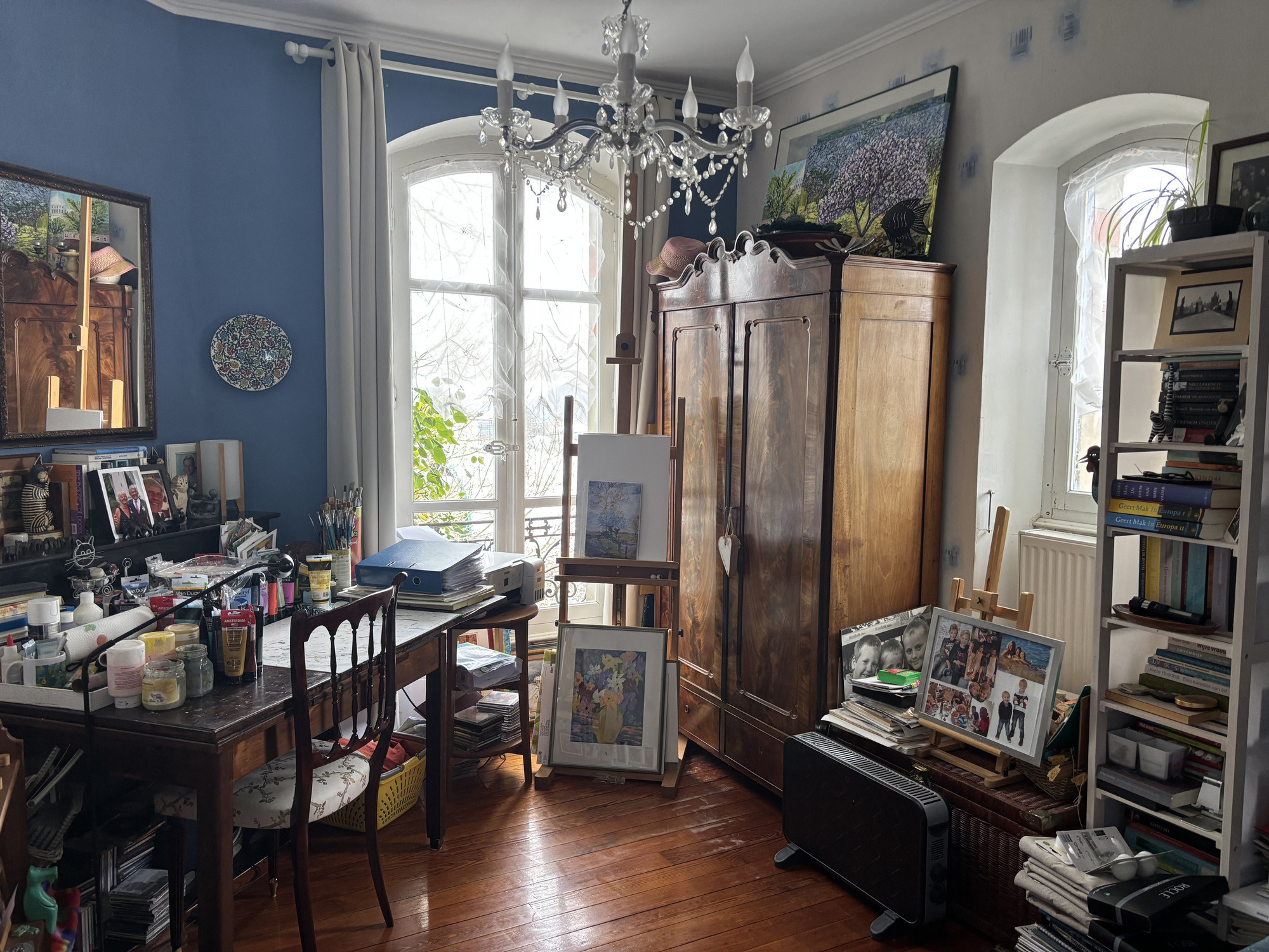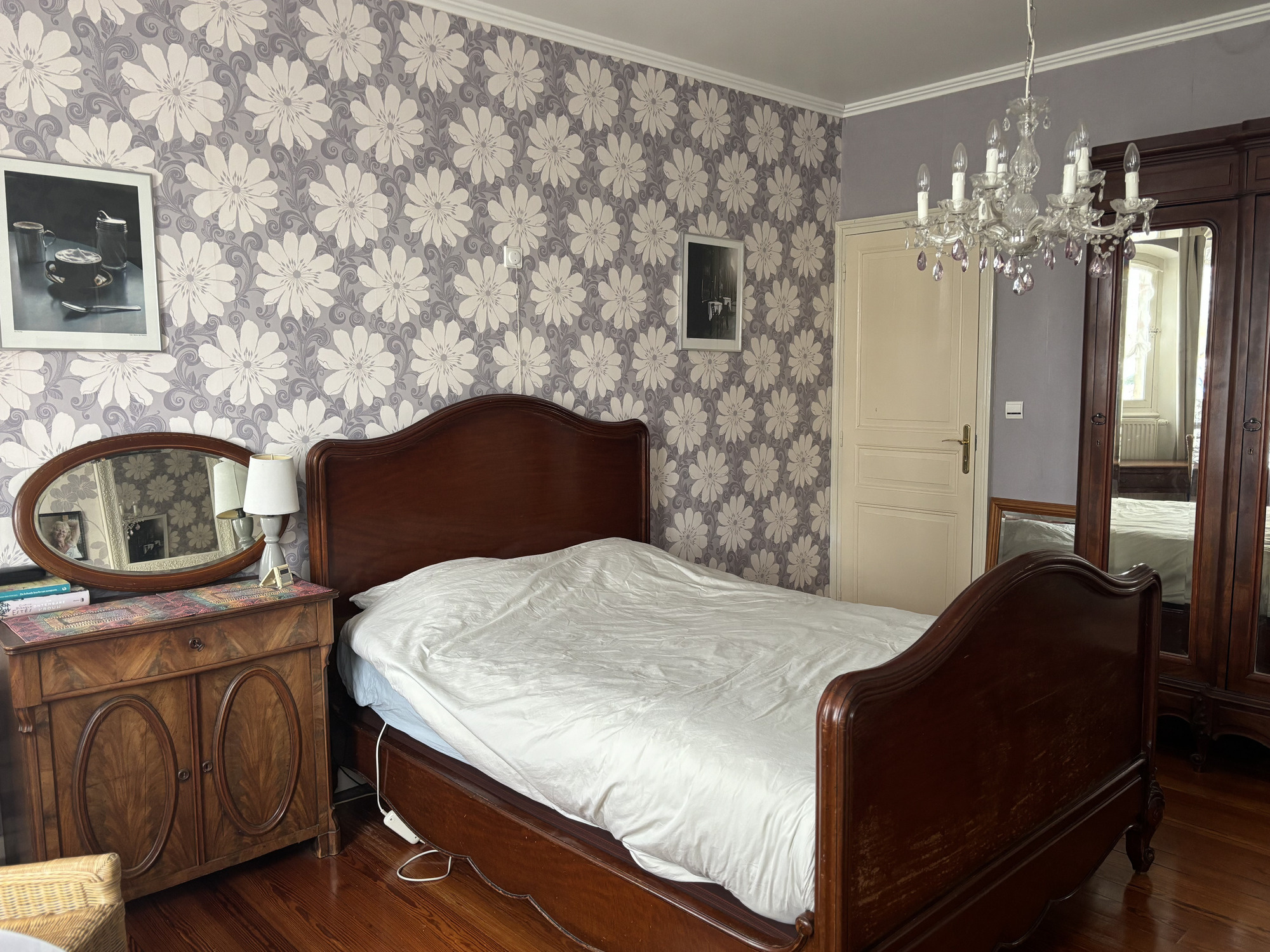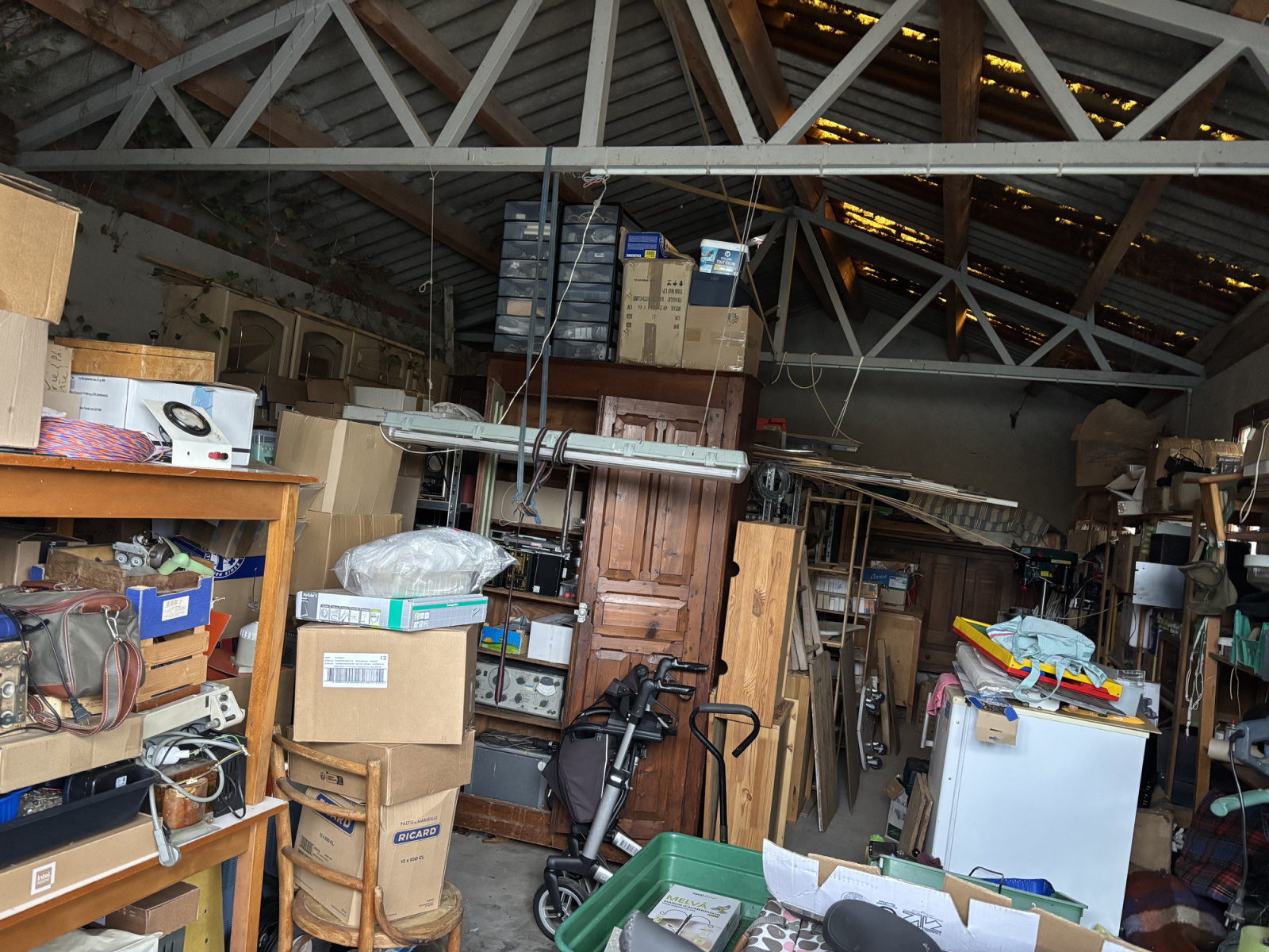 Une autre porte mène du hall à la salle à manger, actuellement utilisée comme espace de rangement, également avec parquet.