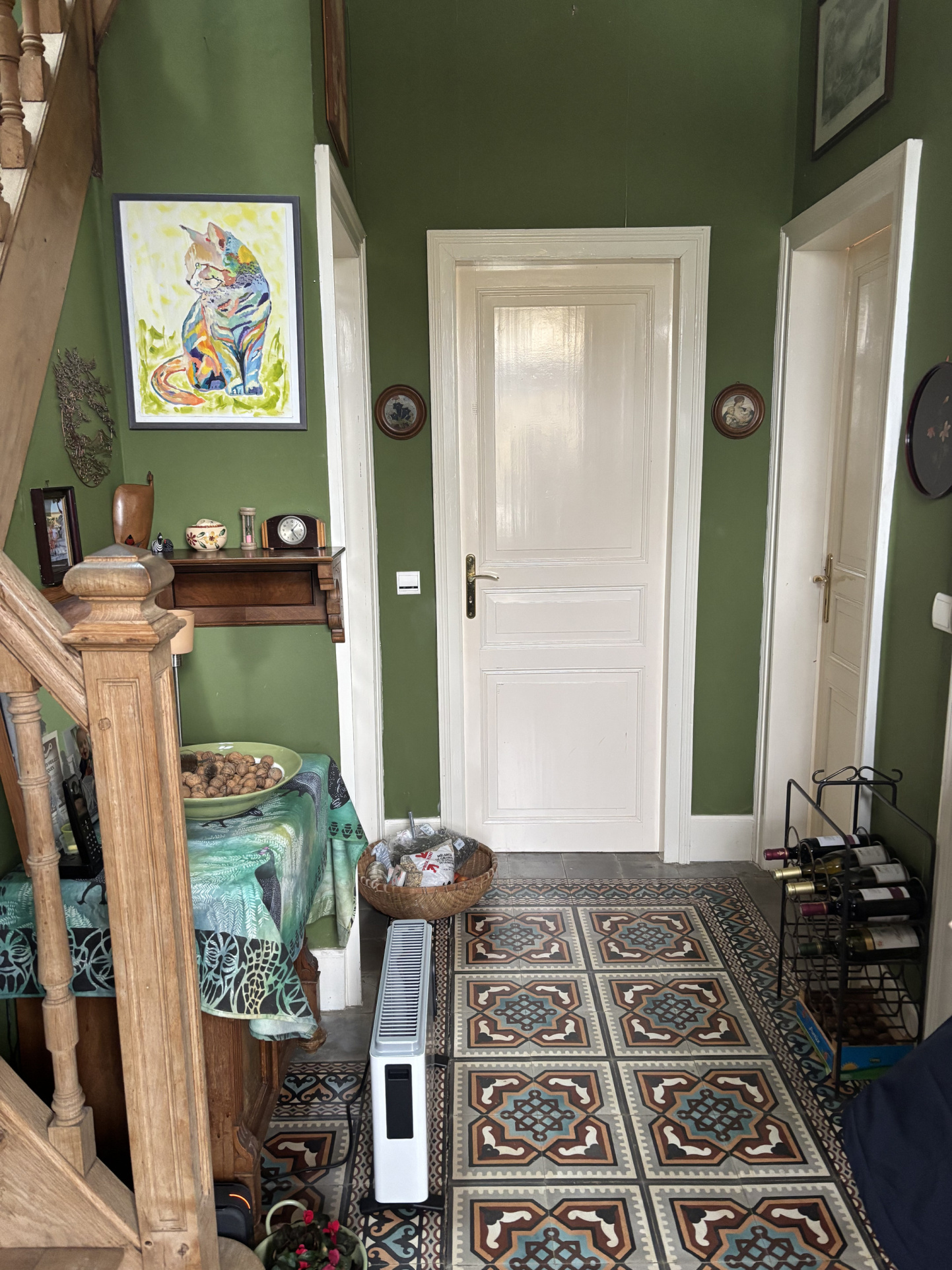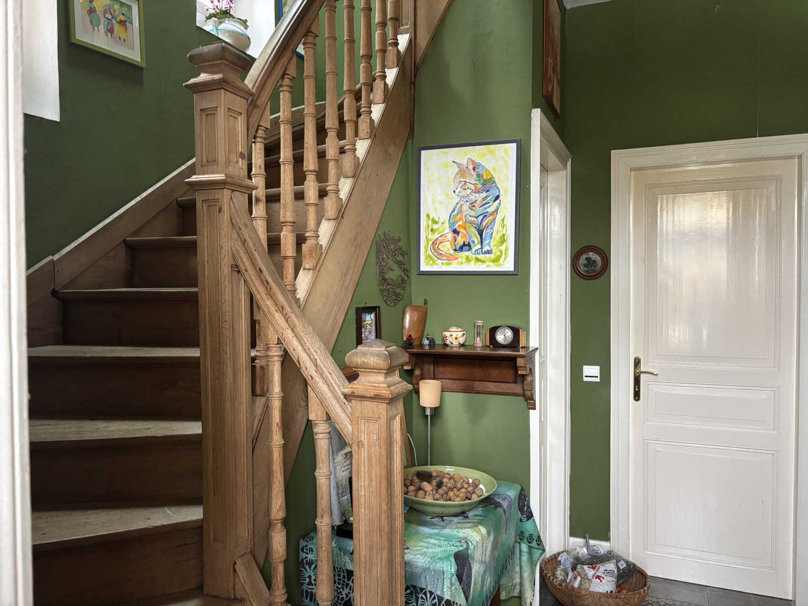 Entrée dans le hall avec un sol carrelé authentique et un bel escalier en chêne menant à l'étage supérieur.