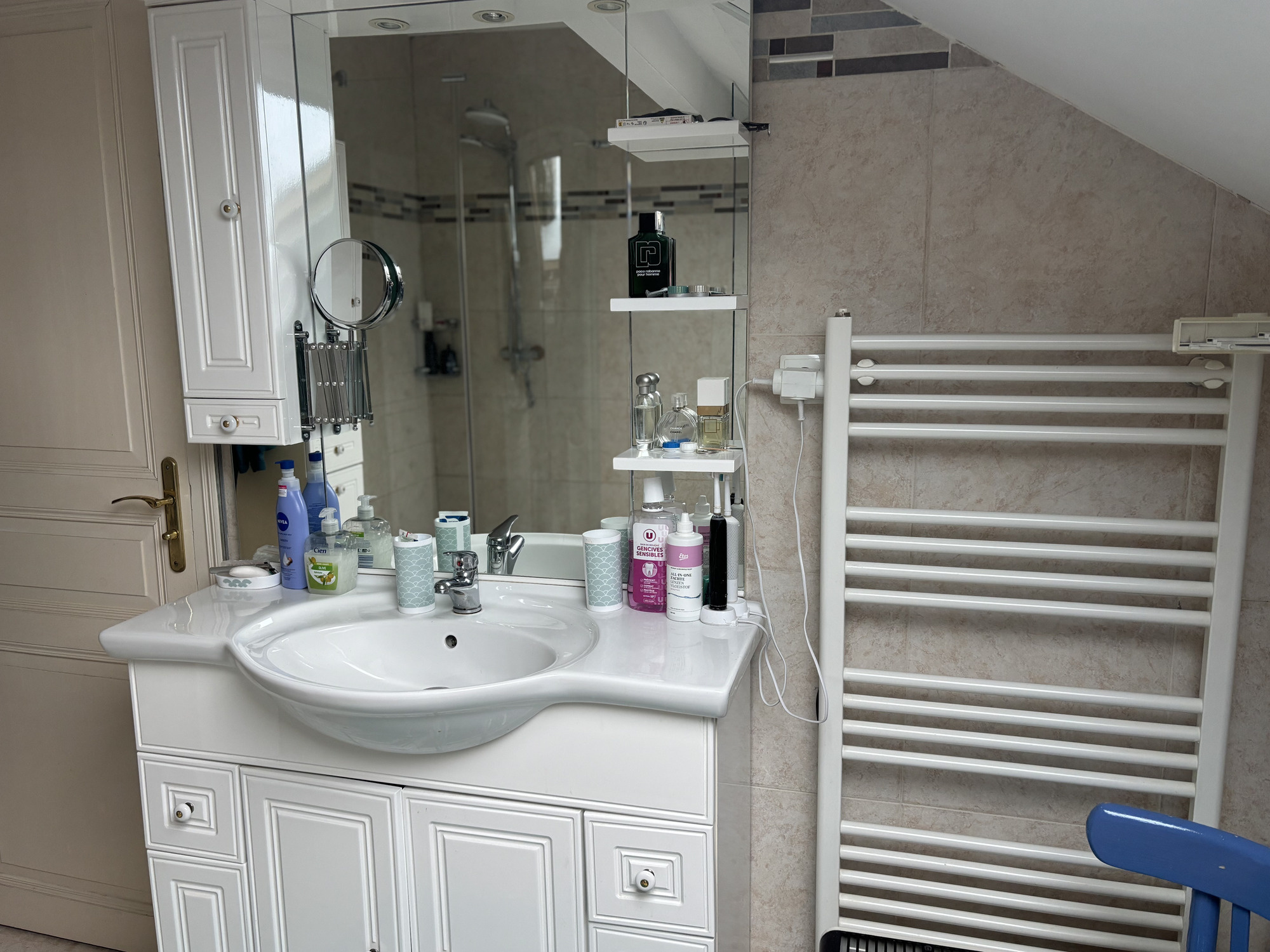Le palier donne accès à des toilettes séparées avec lavabo et placard intégré, à une première chambre avec accès au grenier par une échelle escamotable, à une deuxième chambre spacieuse et enfin à une salle de bains lumineuse avec douche à l'italienne, baignoire, lavabo et radiateur sèche-serviettes.