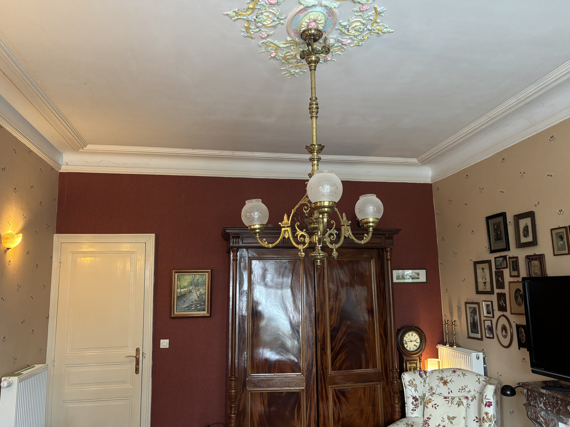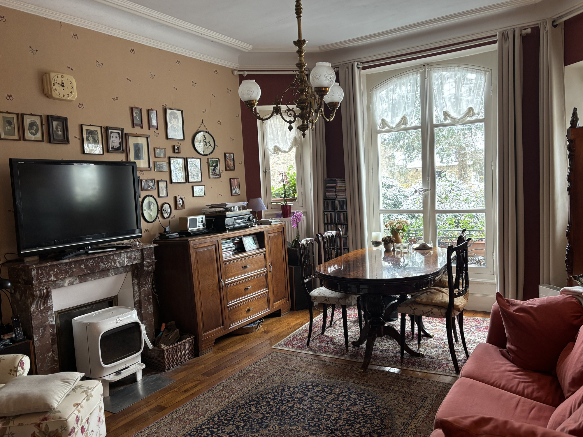 Depuis le hall, une porte mène également au salon avec poêle à bois, parquet d'origine en bon état et détails charmants tels que les moulures au plafond.