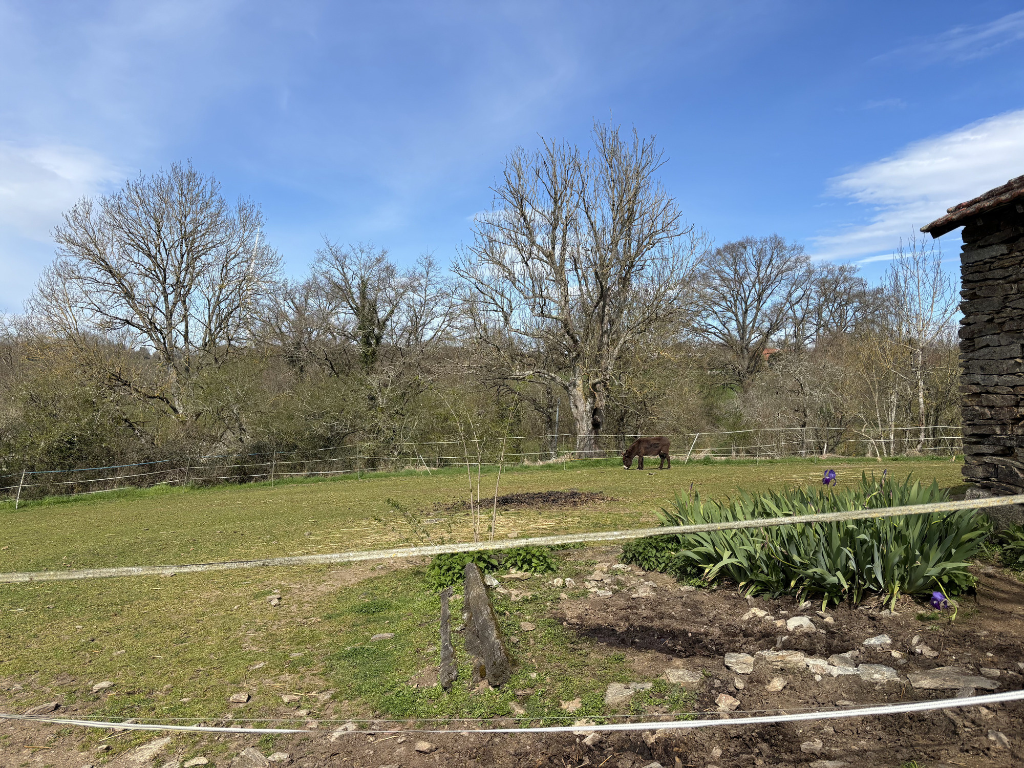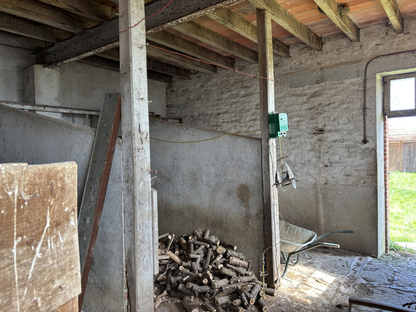 Depuis cette cour, un portail mène à une autre partie de la propriété où se trouve un grand hangar en pierre naturelle avec un sol en béton. Il y a de l'électricité et l'espace est utilisé comme atelier et pour les réunions d'été avec la famille et les amis.