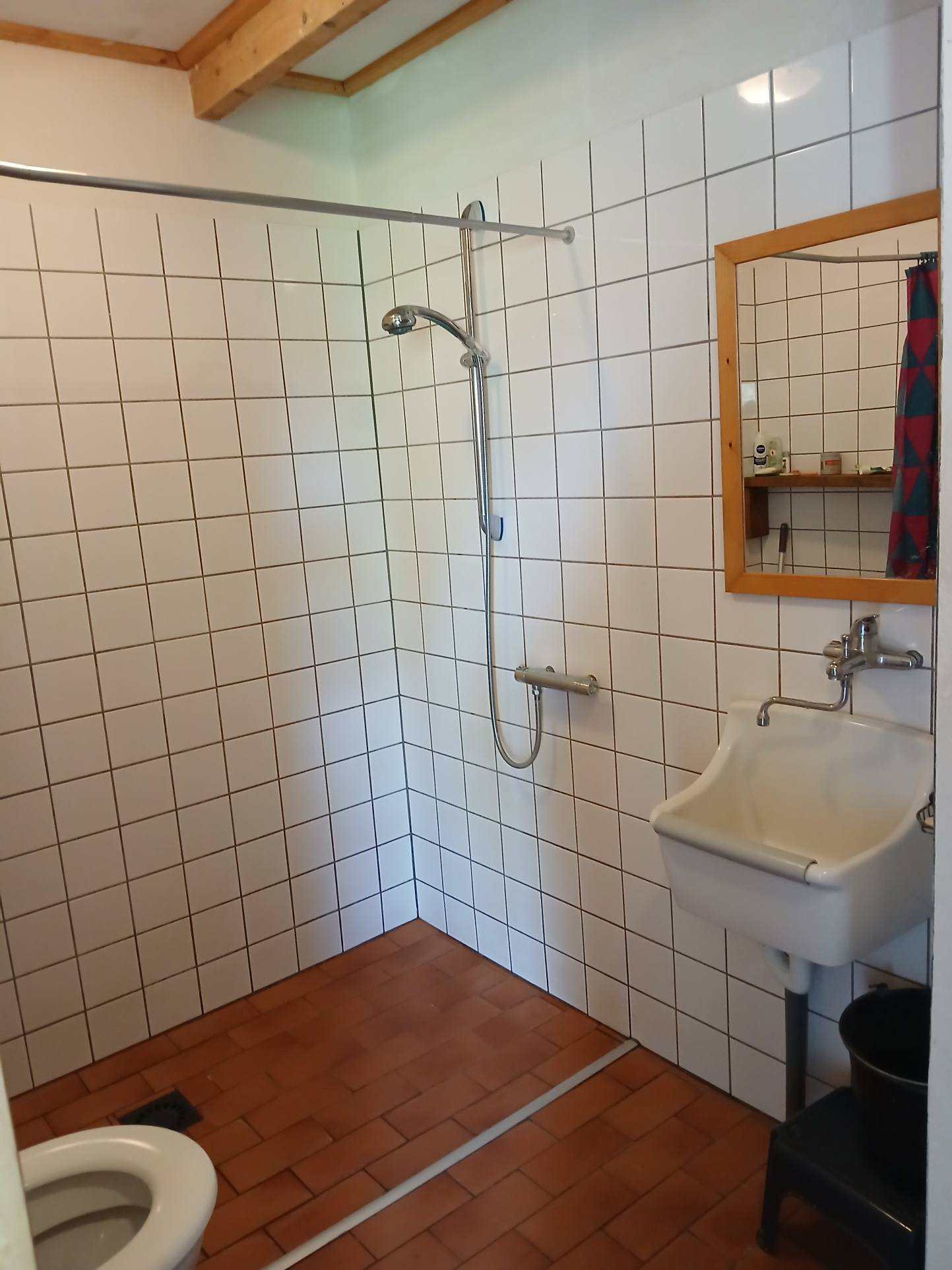 Le premier bâtiment est divisé en deux parties. Dans la partie droite, vous entrez dans le hall, où il y a un branchement pour la machine à laver et l'escalier vers l'étage supérieur. A droite se trouve la salle d’eau avec douche à l'italienne, toilettes et lavabo.