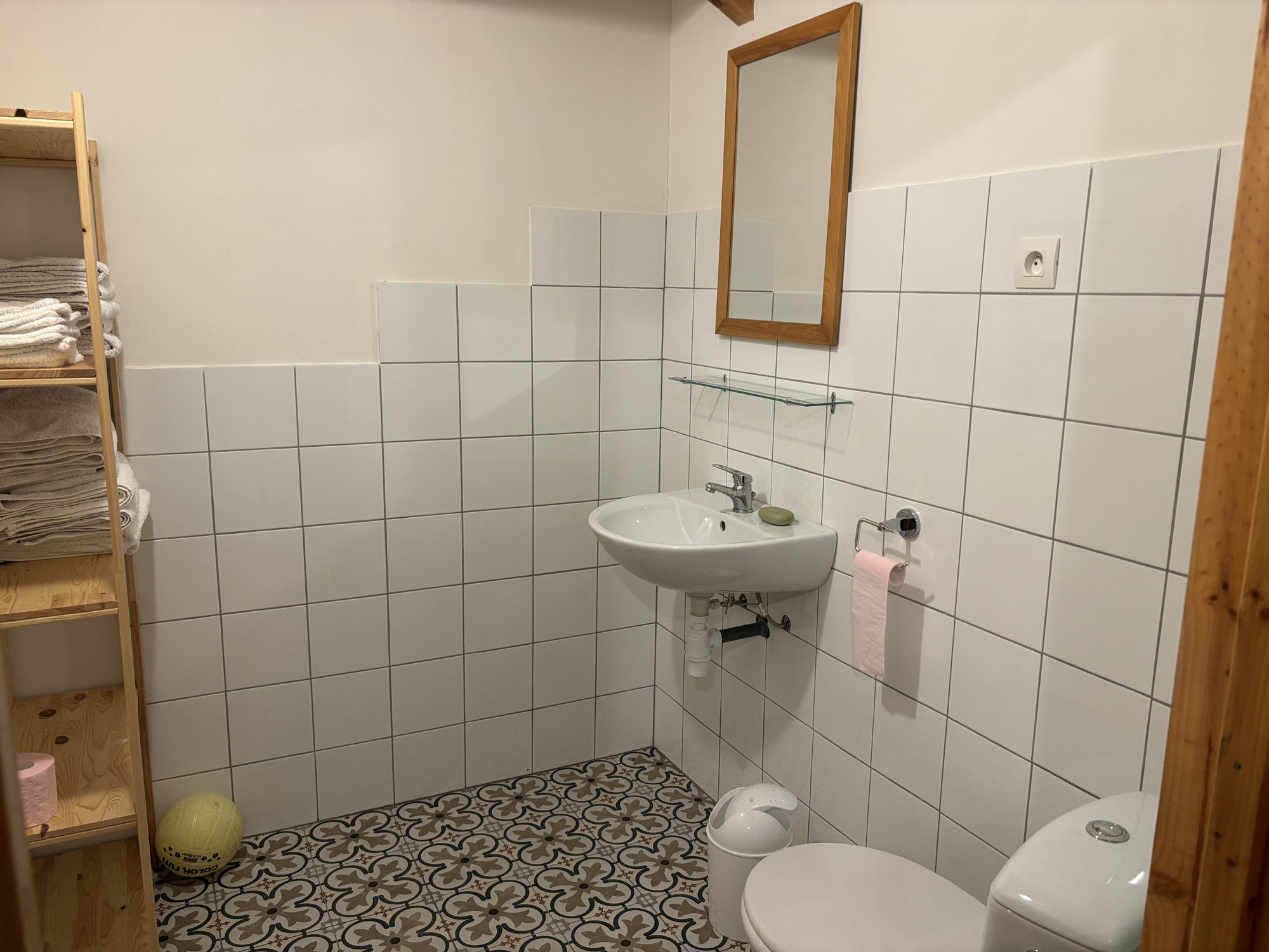 Une porte mène à un hall avec branchement pour la machine à laver, une porte vers la salle d’eau avec douche, toilettes et lavabo, et un endroit où un escalier mènera à l'étage supérieur. L'étage supérieur n'a pas encore été rénové, mais il offre beaucoup d'espace pour créer plusieurs chambres.