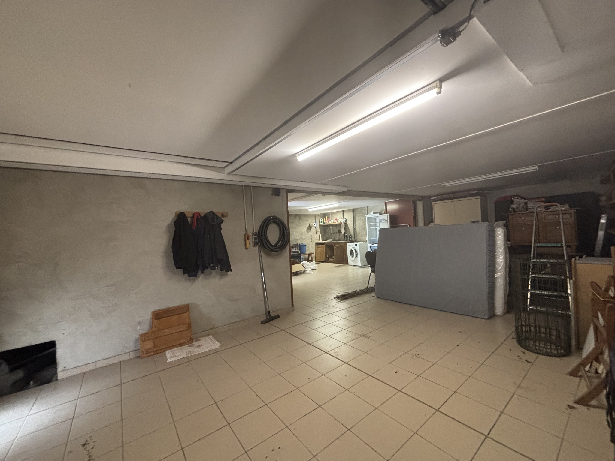 On y rentre par un sous-sol avec un grand garage de 80m² ,toilettes et portail ,un espace bureau de 24m² avec une entrée indépendante (fenêtres en alu et anti-effraction).