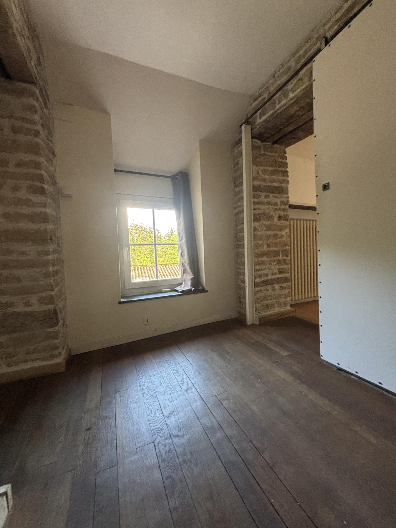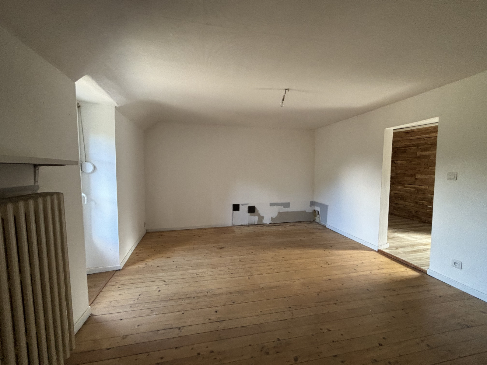 D'une entrée ( murs apparents) , une cusine moderne , une salle d'eau ,une chaufferie et un grand salon lumineux avec une possibilité d'agrandissement en abbattant le mur de la seconde maison , un insert tubé et une vue sur le terrain.