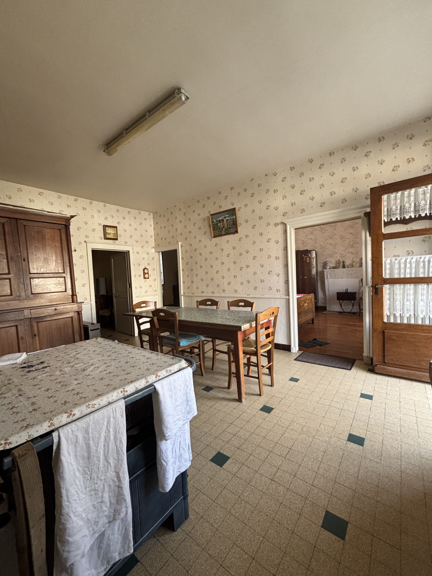 D'une véranda de 8m² récente , une cuisne de 20m² avec un évier en pierre , deux chambres avec parquet chêne et placards de rangement de 16m² environ , un petit salon accedant à un grenier aménageable de 90m² avec une chambre, une salle de bain , un toilette .