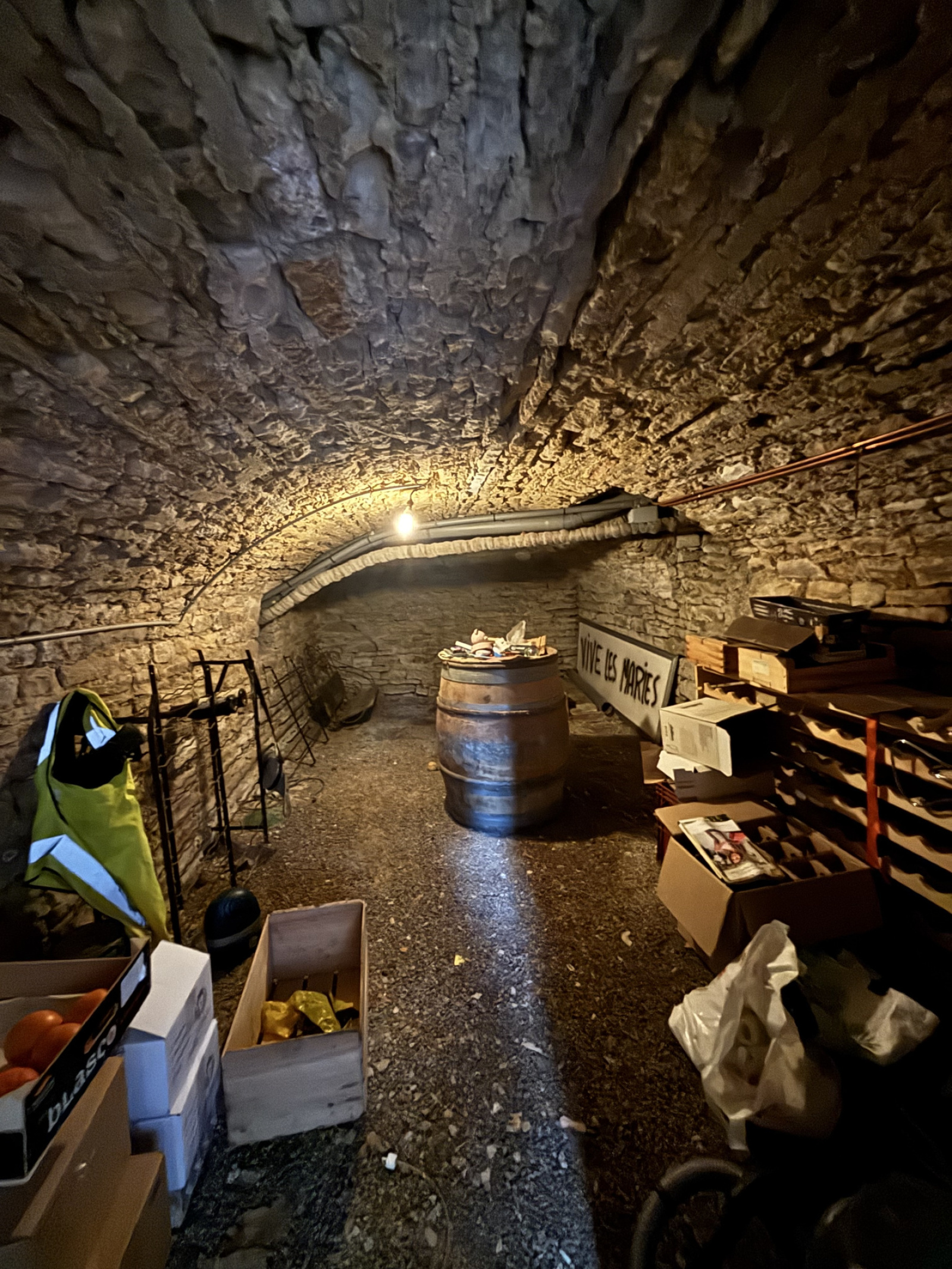 Composée en rez-de-chaussée d'un grand salon de 60m² avec mezzanine (poêle à granule et à bois ), plafond à la française, d'une cave voûtée avec accès intérieur, d'une cuisine équipée, d'un espace donnant accès à une spacieuse salle de douche.