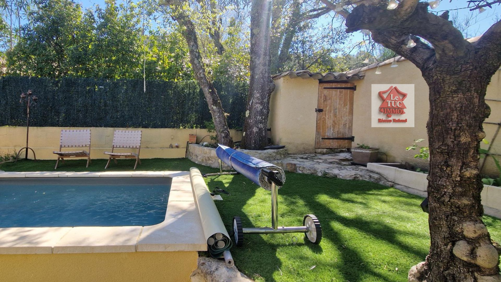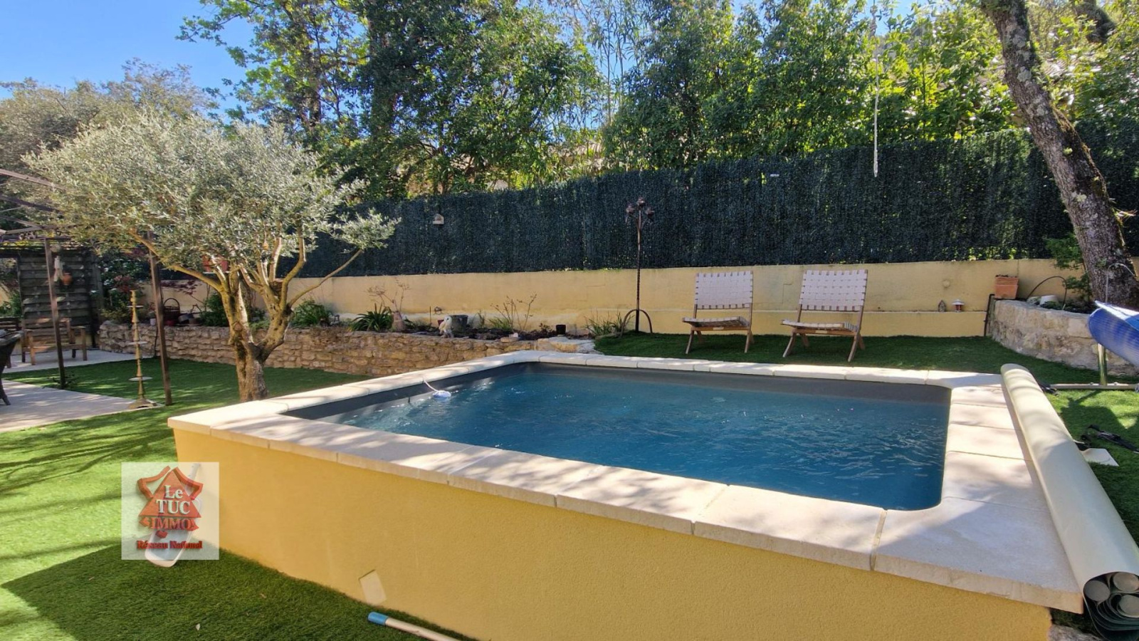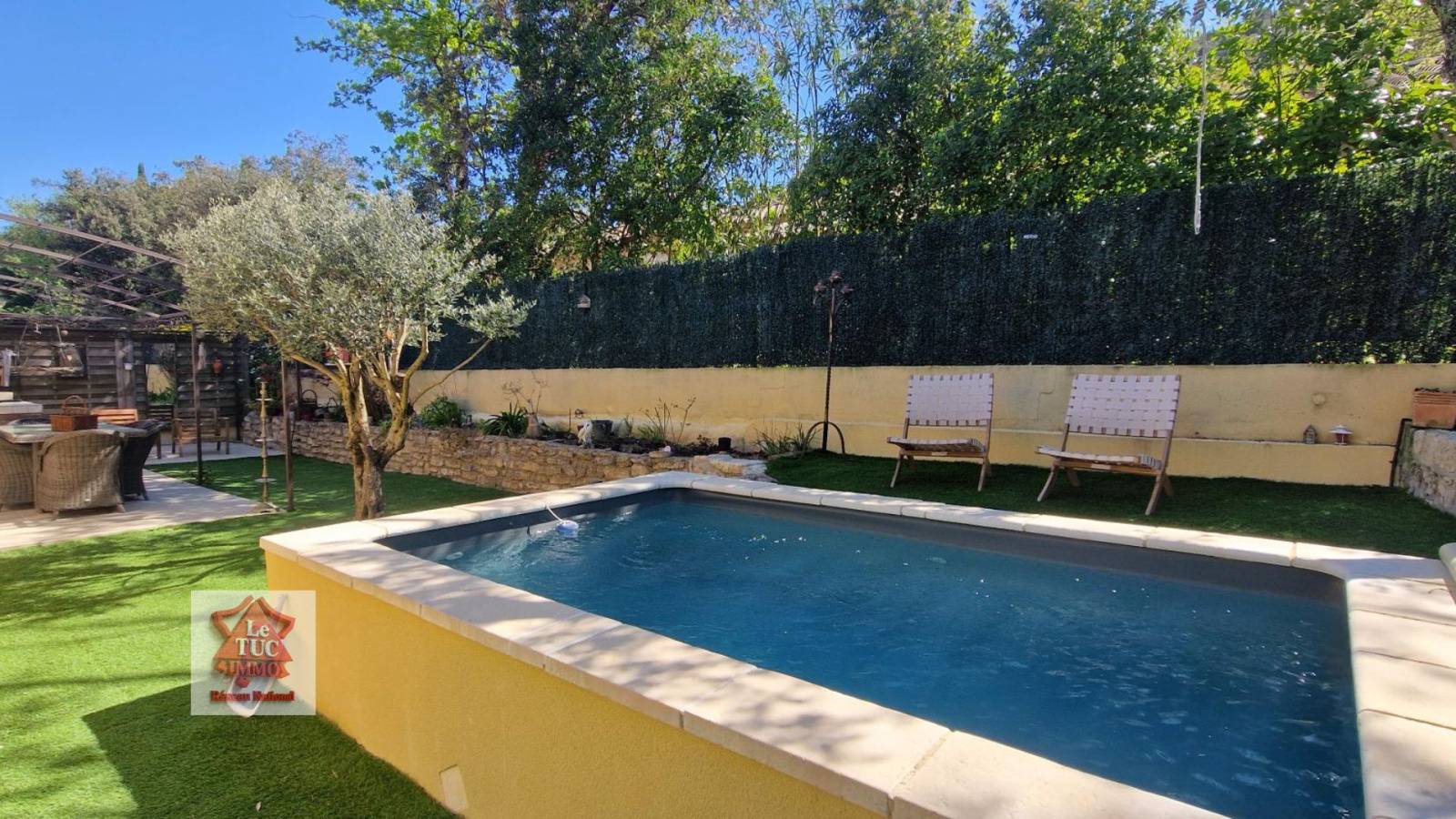 A l'extérieur le charme opère tout autant : un jardin joliment aménagé, facile à entretenir, une belle terrasse carrelée avec pergola et un coin piscine 3x4 qui vient parfaire cet espace intime et apaisant.