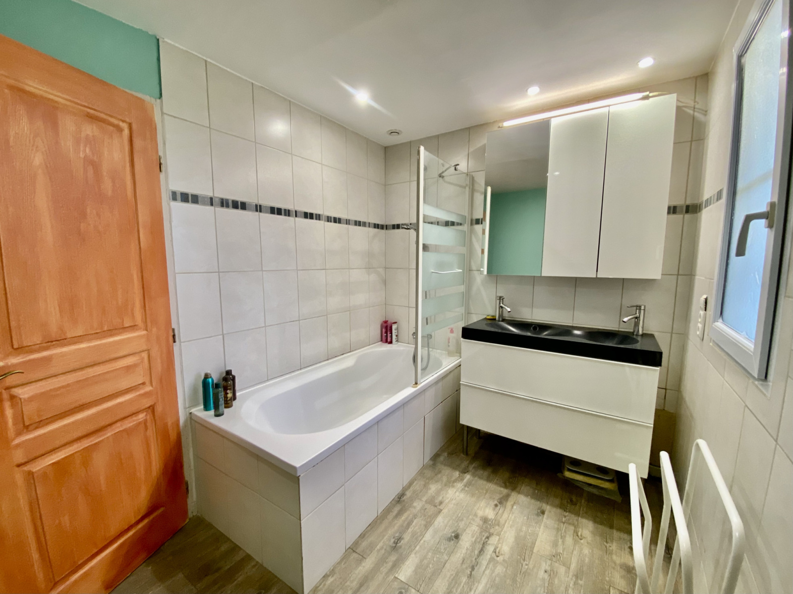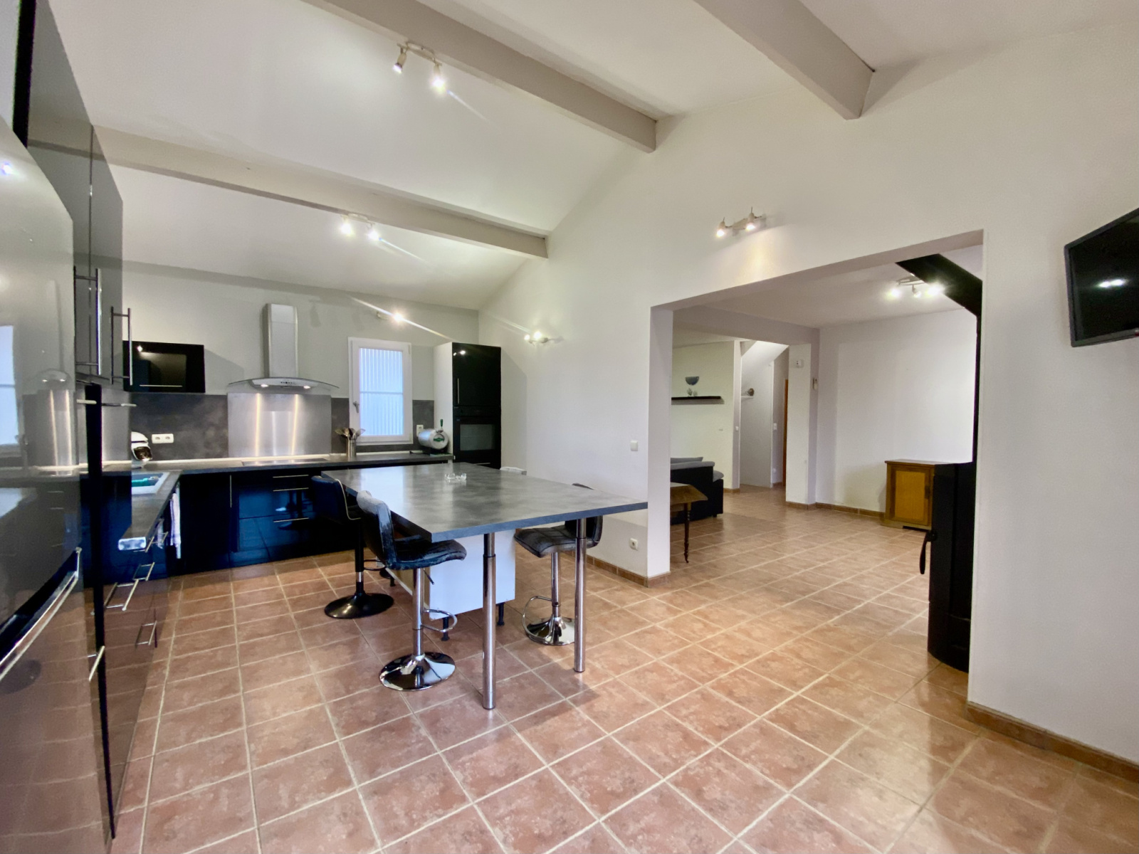 Au rez-de-chaussée, un double séjour et une vaste cuisine aménagée et équipée (plafond cathédrale) ouvrent sur la terrasse. Le rez-de-chaussée comprend aussi une chambre, une salle de bain, une buanderie, un garage et un Wc indépendant.