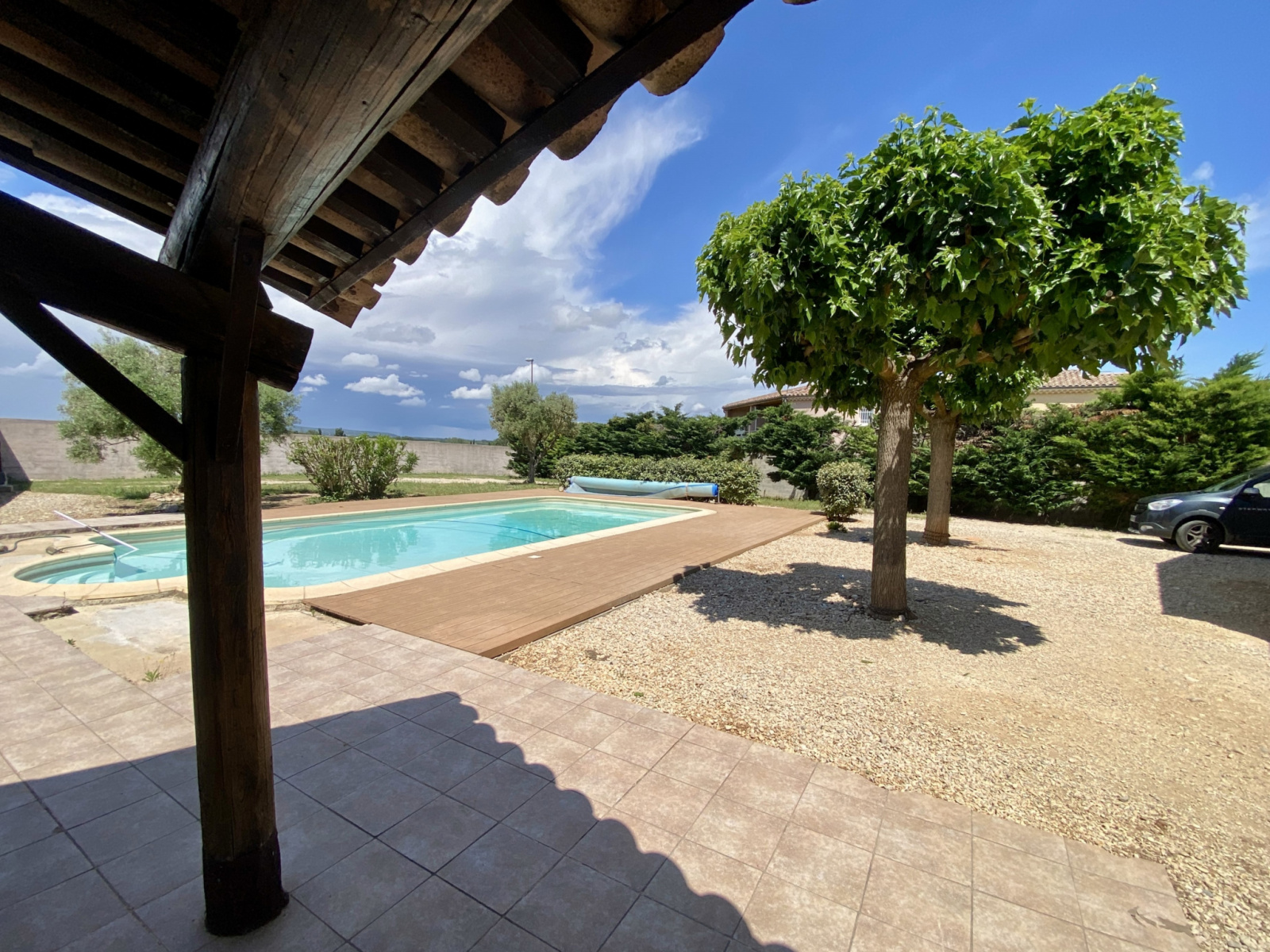 Le jardin arboré est entièrement clôturé, et équipé d’une piscine (5m x 10m) avec plage de piscine (dalles et bois composite) et un pool house (douche et cuisine d’été).