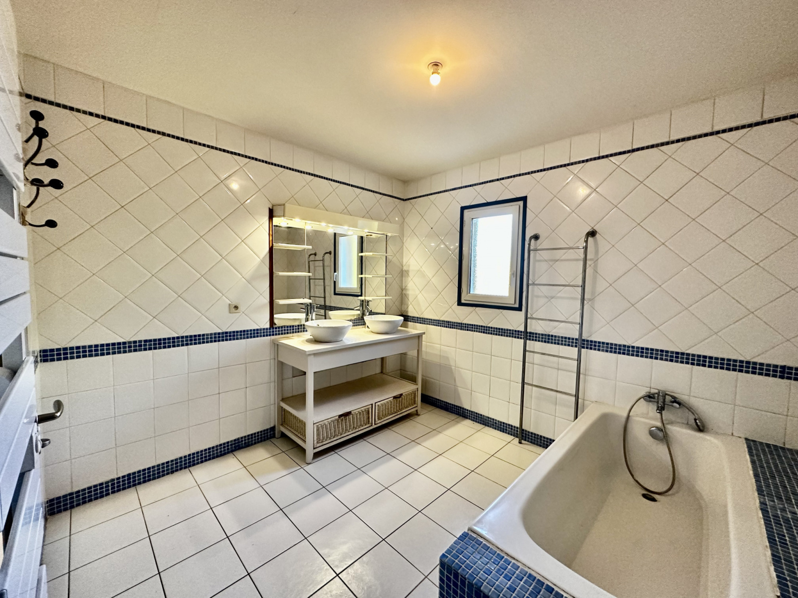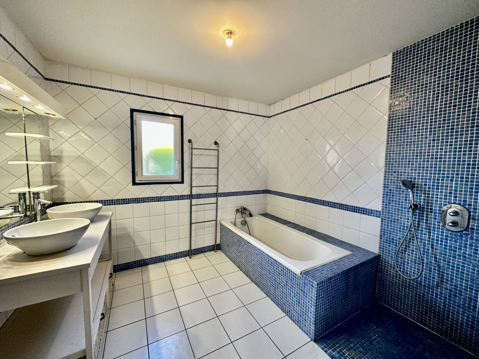 Côté confort, la maison dispose d'une grande salle de bain avec baignoire/double à l'italienne, un meuble double vasque et un sèche-serviette.