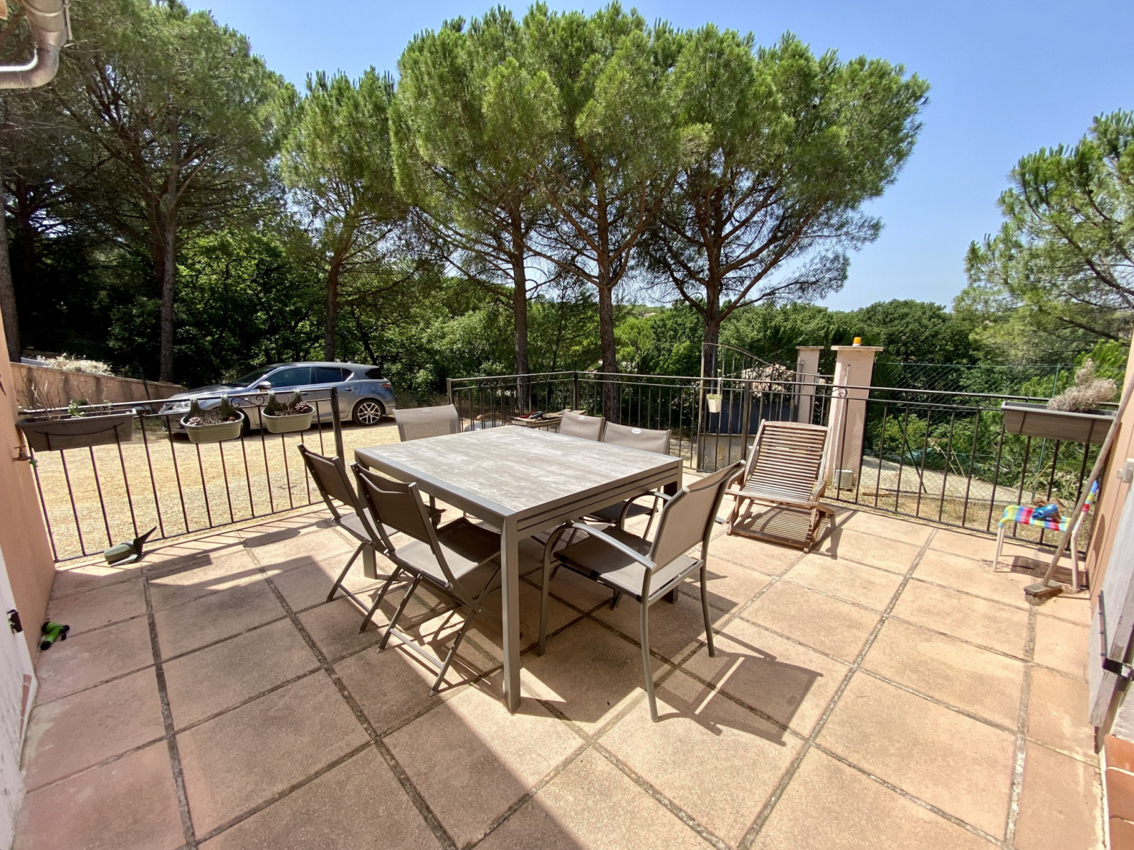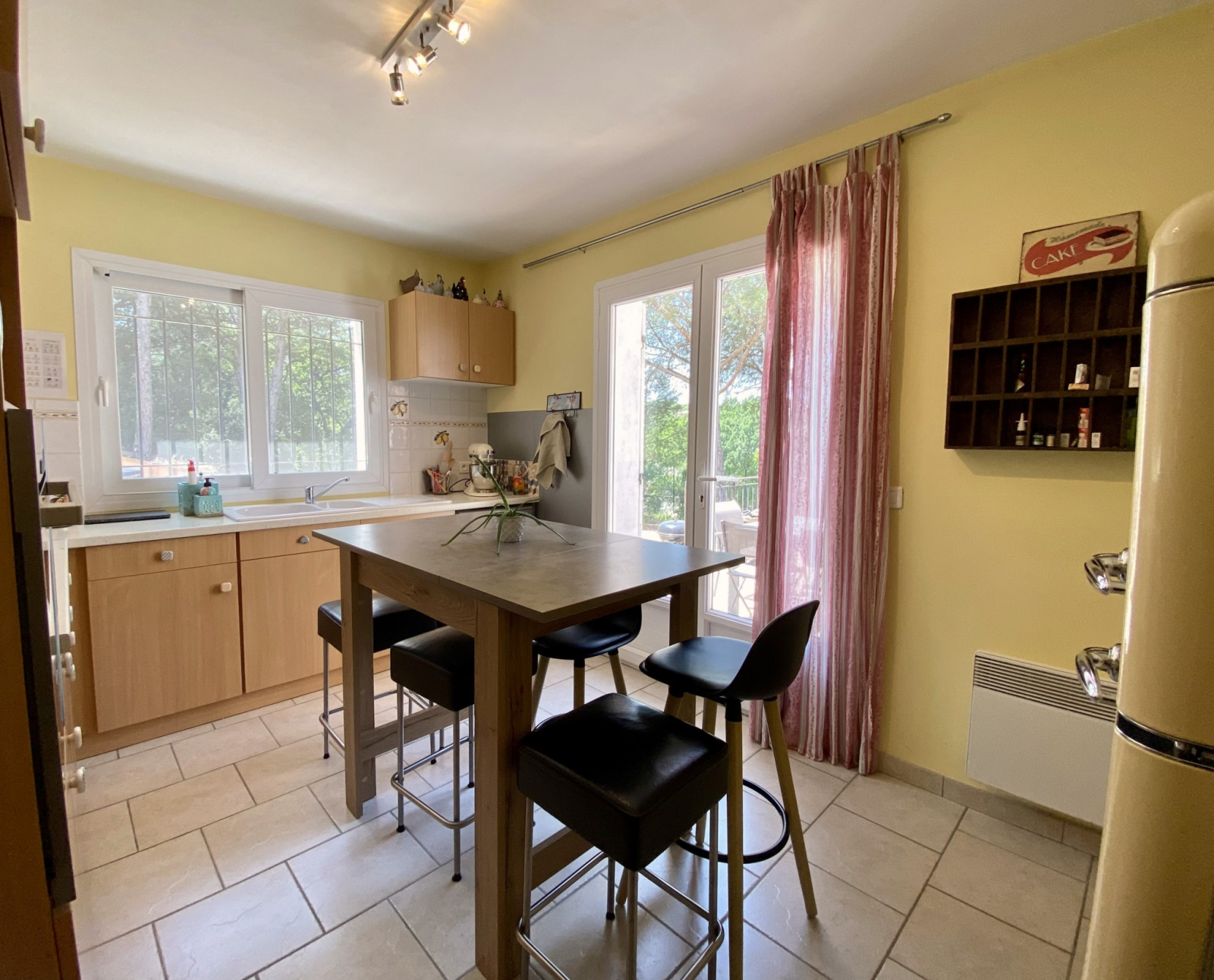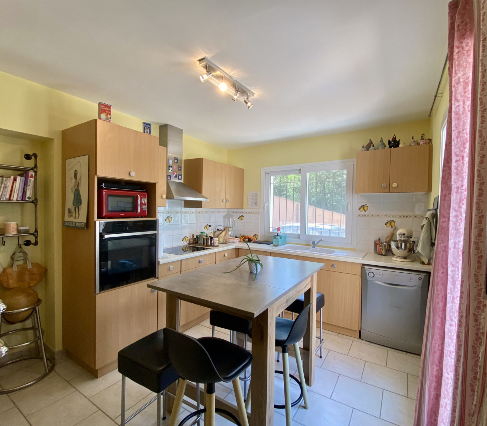 La cuisine ouvre sur une agréable terrasse avec une vue imprenable et dégagée sur le massif d'Uchaux.