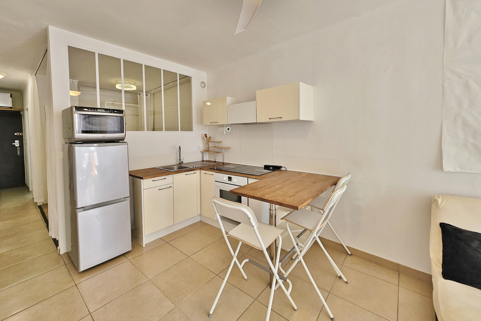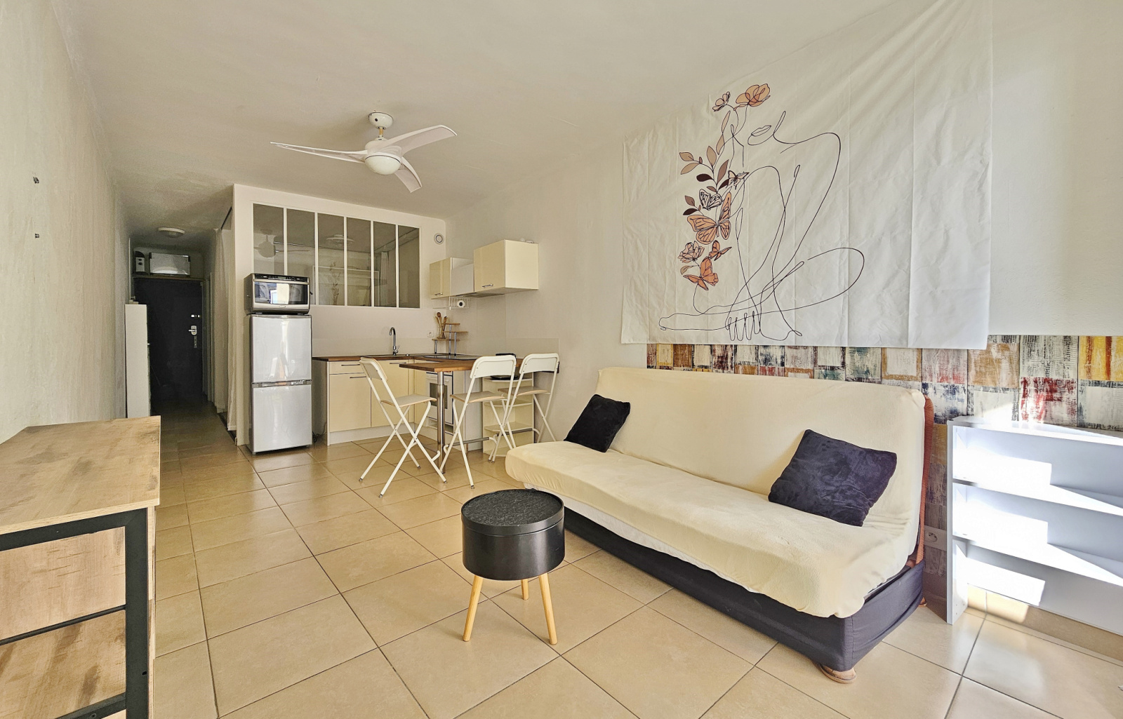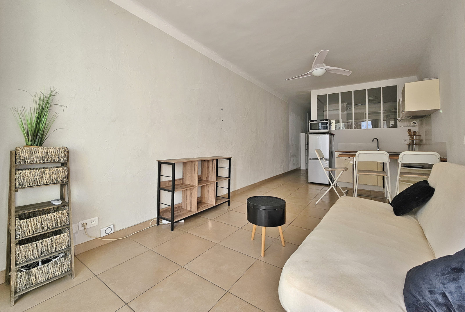 Entièrement rénové et meublé, il se compose d'une entrée, d'un séjour avec cuisine équipée ouverte, d'une chambre séparée avec placards et espace buanderie, et d'une salle d'eau avec wc.