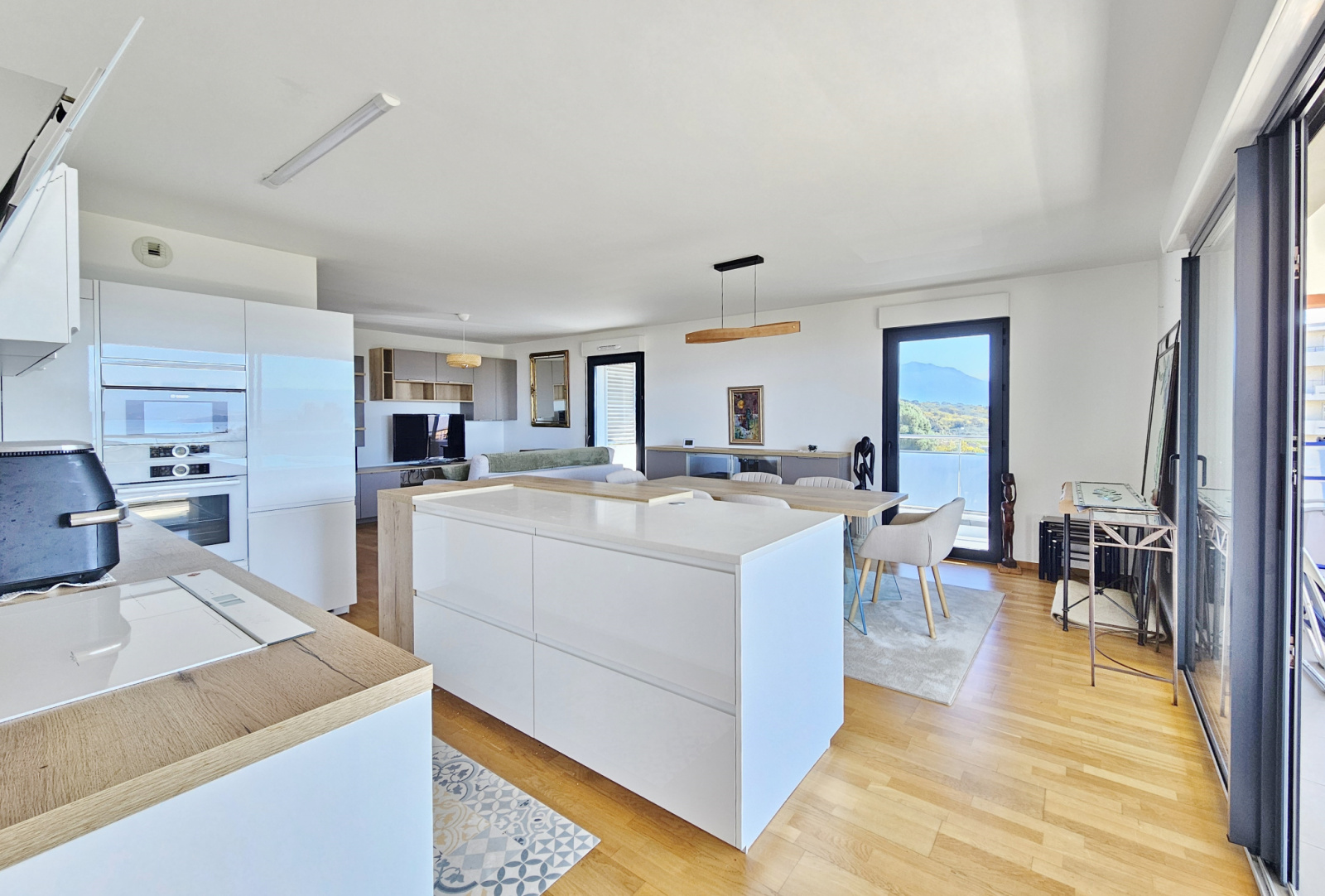 Exposé plein sud en pignon, il dispose d'une superbe terrasse couverte de 40m² avec jolie vue mer. D'une superficie de 88m², il se compose d'une entrée avec pièce de cellier/rangements et wc, d'une lumineuse pièce à vivre de 43m² avec salon, espace repas et cuisine équipée ouverte.
