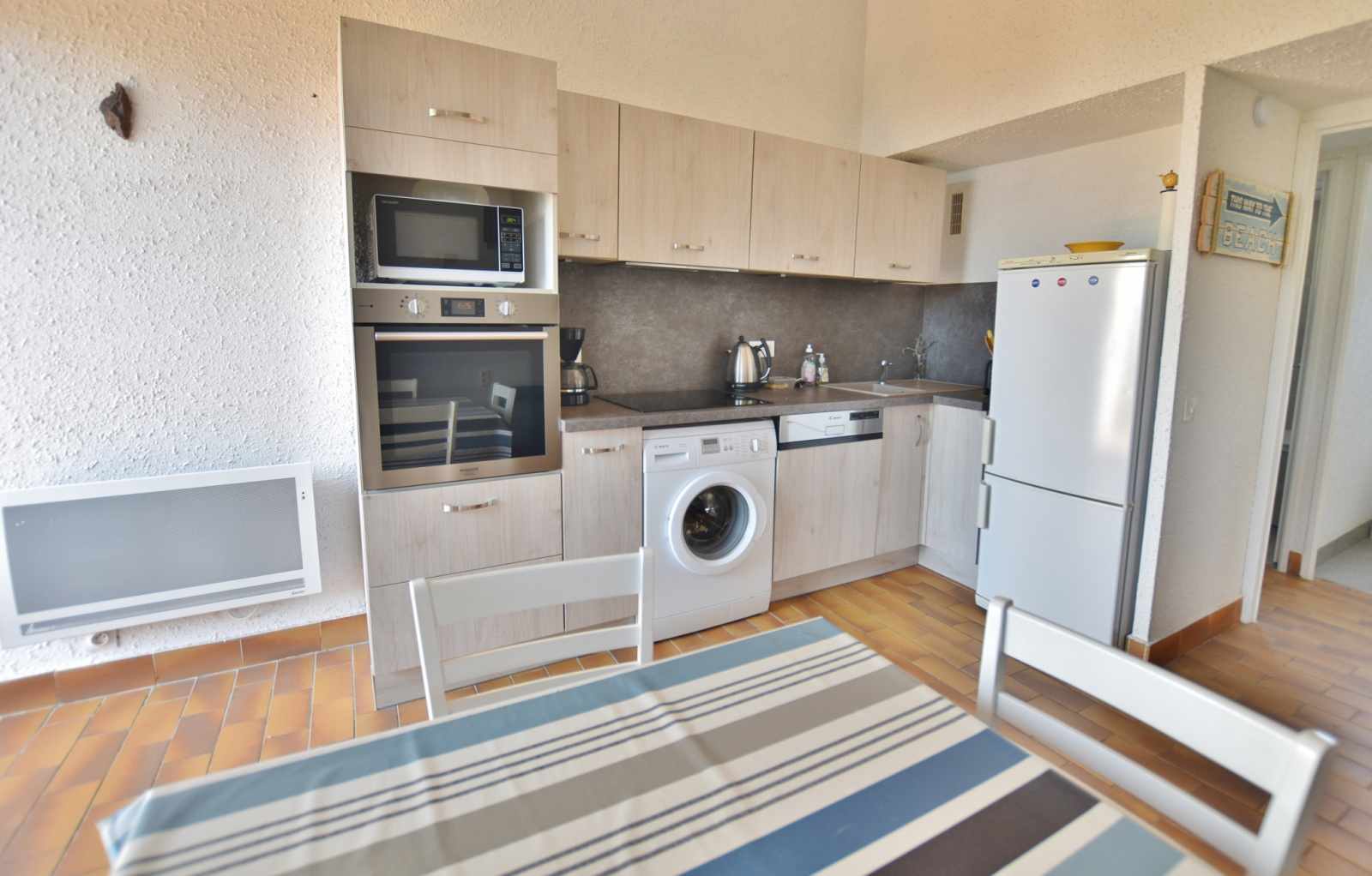 . Au RDC : une entrée, un séjour avec cuisine équipée ouverte, une chambre, une salle de bain et un wc séparé