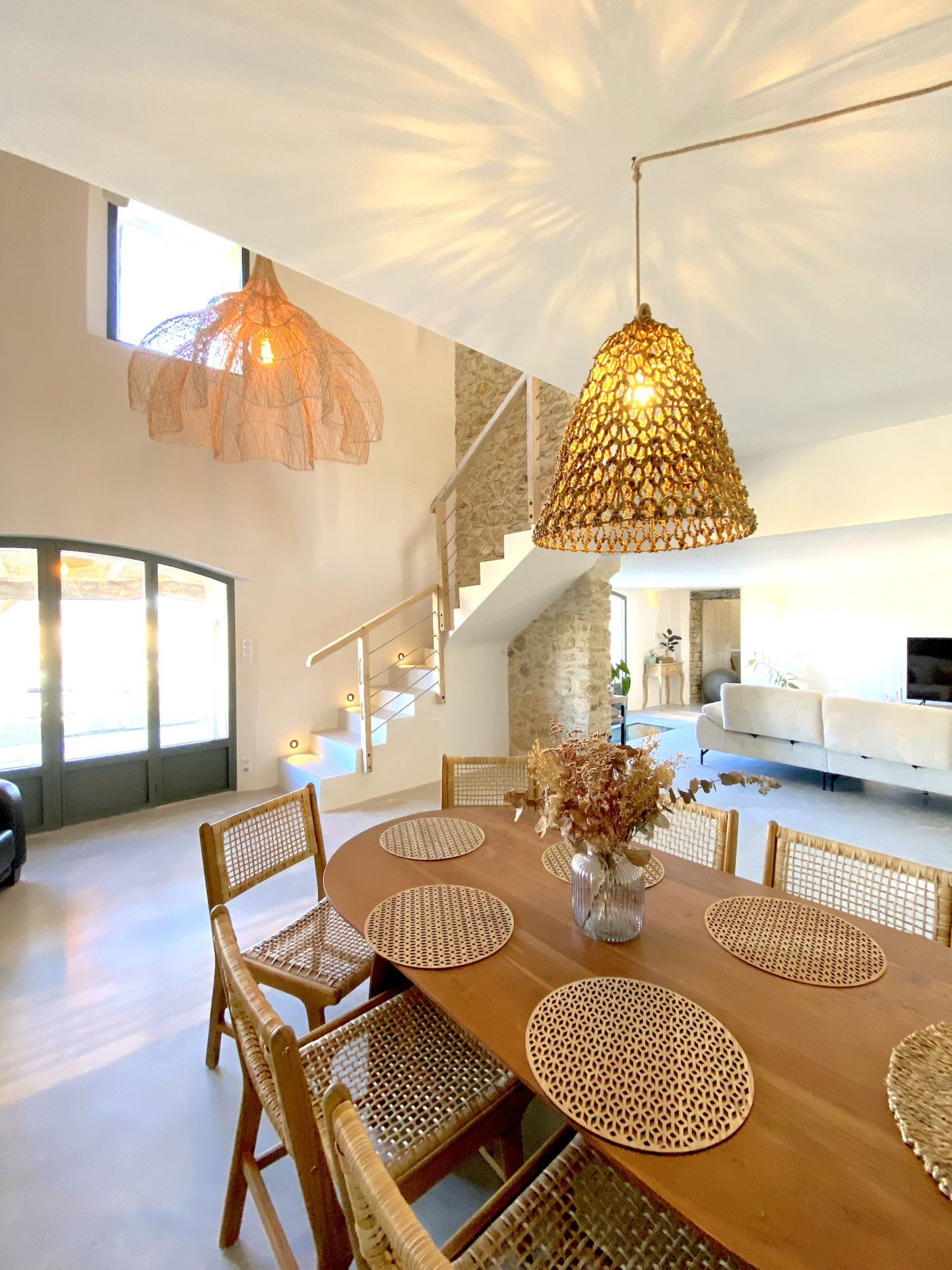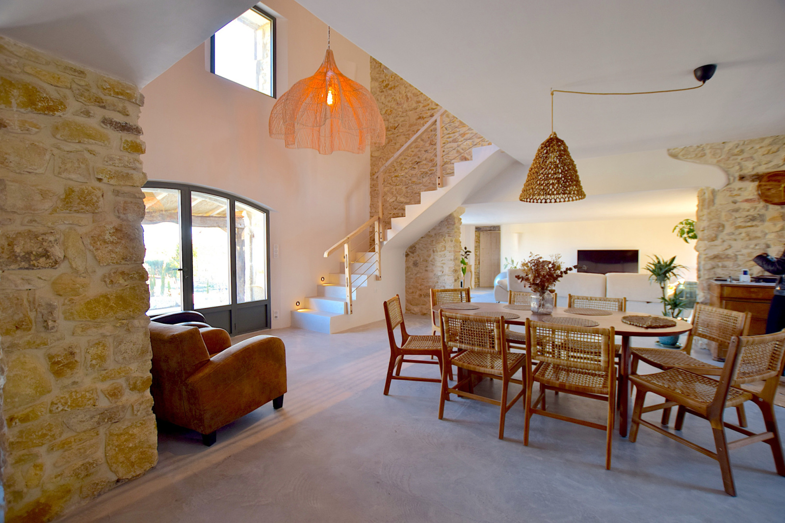 Entièrement rénovée afin d’ouvrir les espaces et de créer une atmosphère à la fois épurée et chaleureuse, la propriété met en valeur des matériaux simples mais raffinés : pierre apparente, bois brut, murs plâtrés et plancher en béton ciré chauffant/rafraîchissant par pompe à chaleur, lui conférant un excellent classement énergétique A/A.
