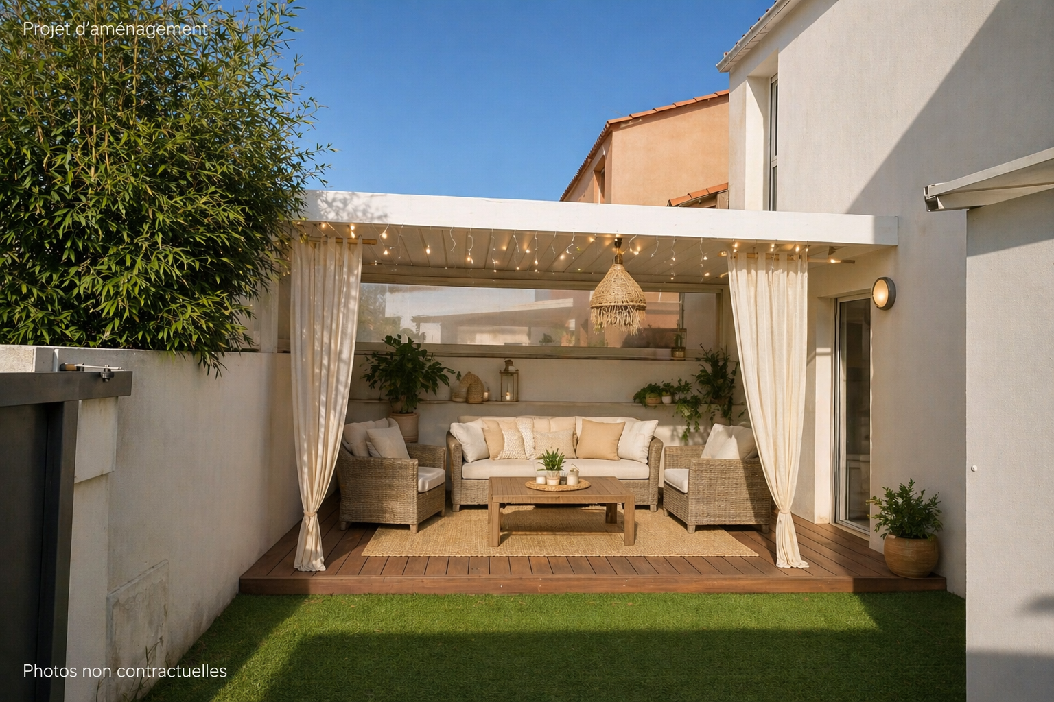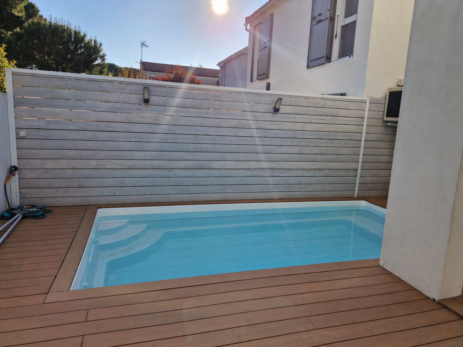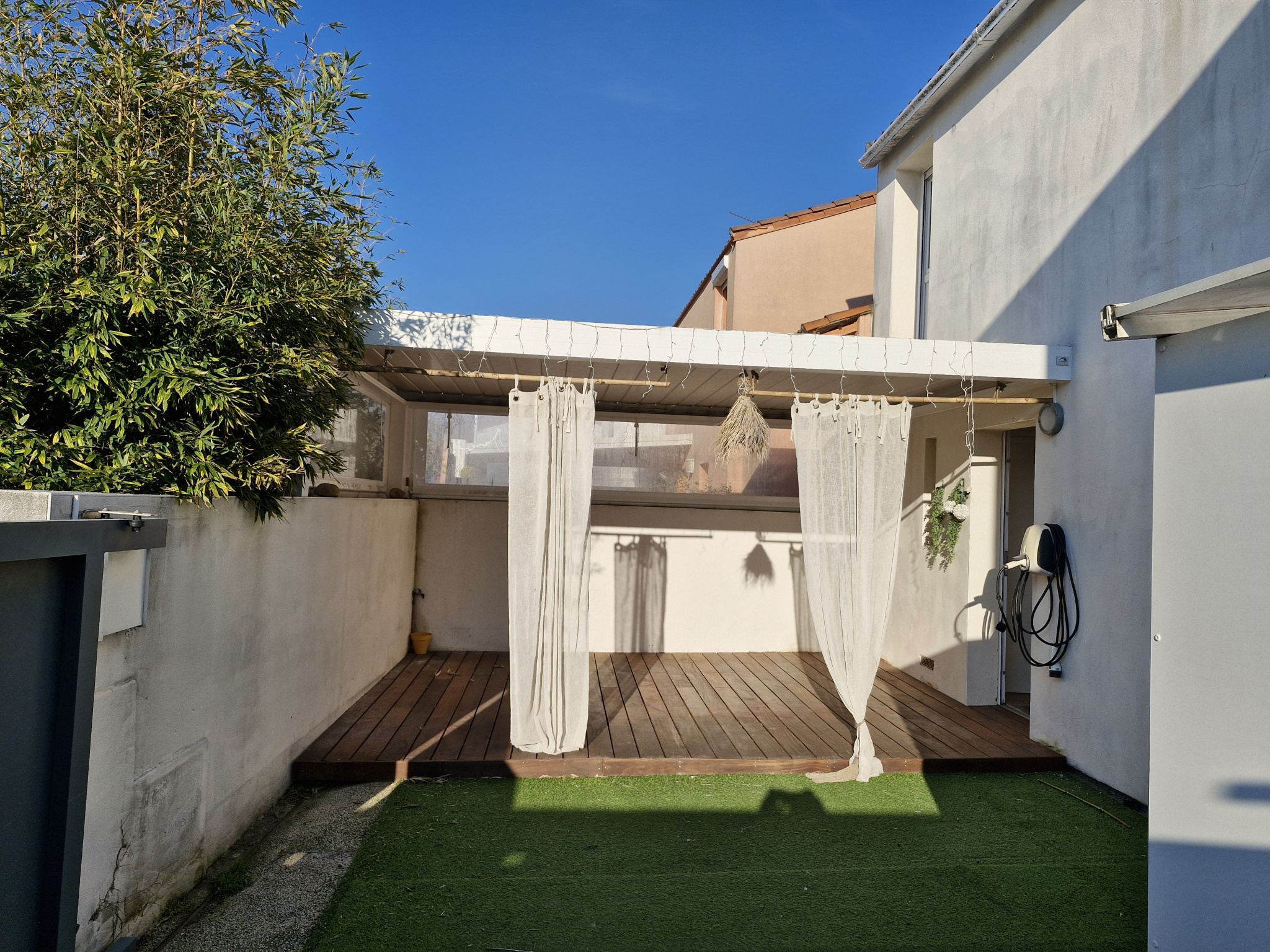 À l’extérieur, place à la détente : profitez d’un espace parfaitement aménagé avec piscine chauffée et pergola bioclimatique, véritable pièce de vie supplémentaire pour vos repas et moments de convivialité en toute saison.