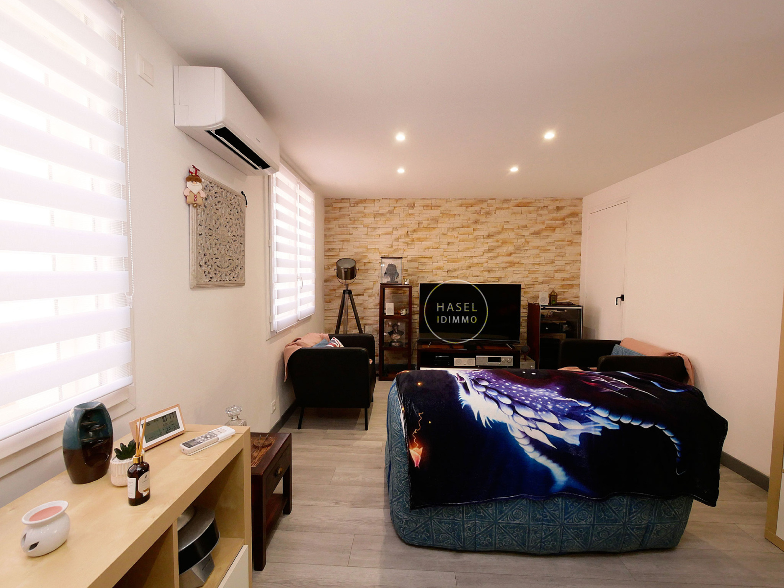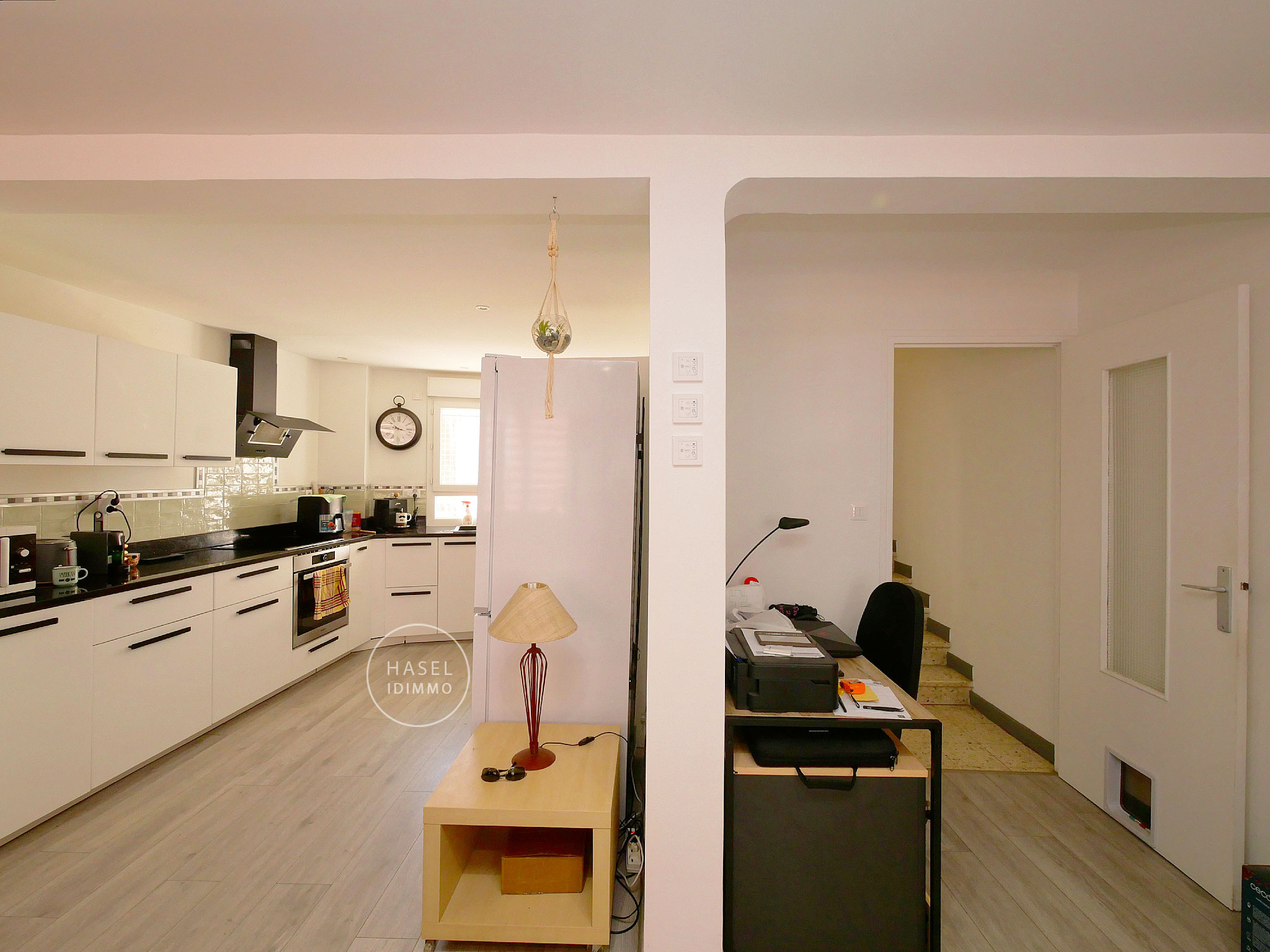 La partie jour de 37 m² est au 1er étage avec salon-coin repas, cuisine équipée (plan de travail en marbre) et petit bureau.