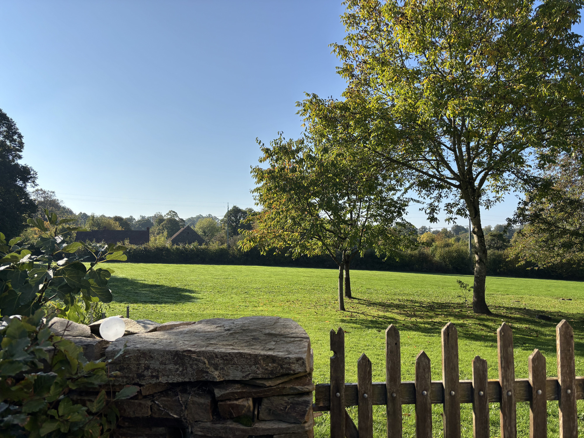 Depuis la salle à manger, vous accédez au salon, également équipé d'une climatisation (refroidissement/chauffage) et d'une grande fenêtre offrant une vue magnifique sur le pré privé.