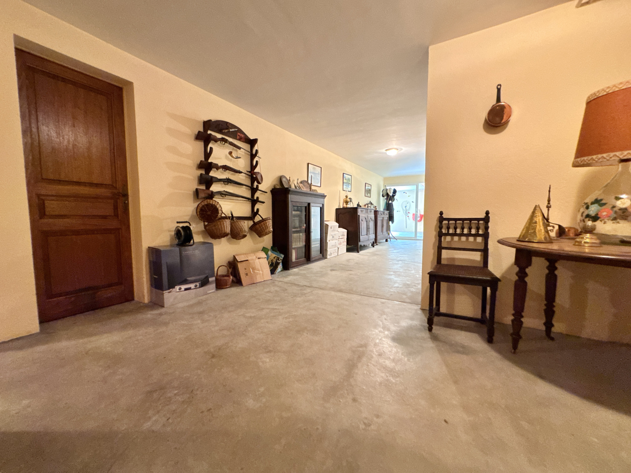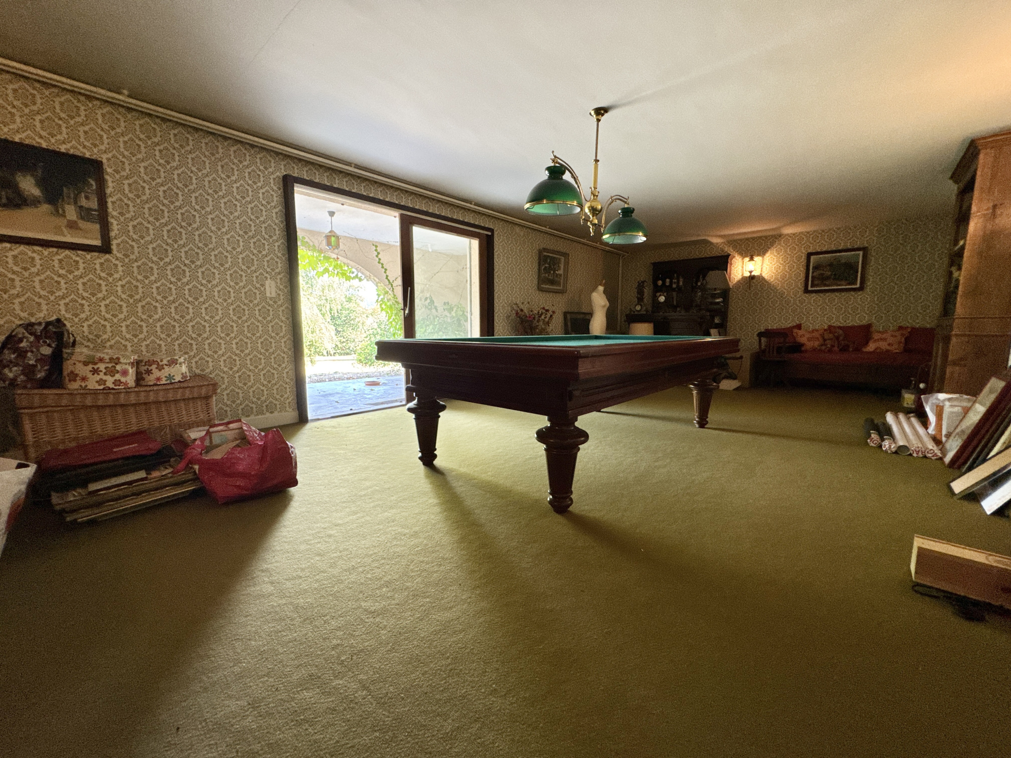 Grand couloir, WC indépendant avec évier (possible salle d’eau), chaufferie, buanderie avec évier de 15,30 m², salle de jeux avec billard de 42 m² avec terrasse couverte, cave à vin de 16 m², grand garage sécurisé avec porte électrique de 54,60 m².