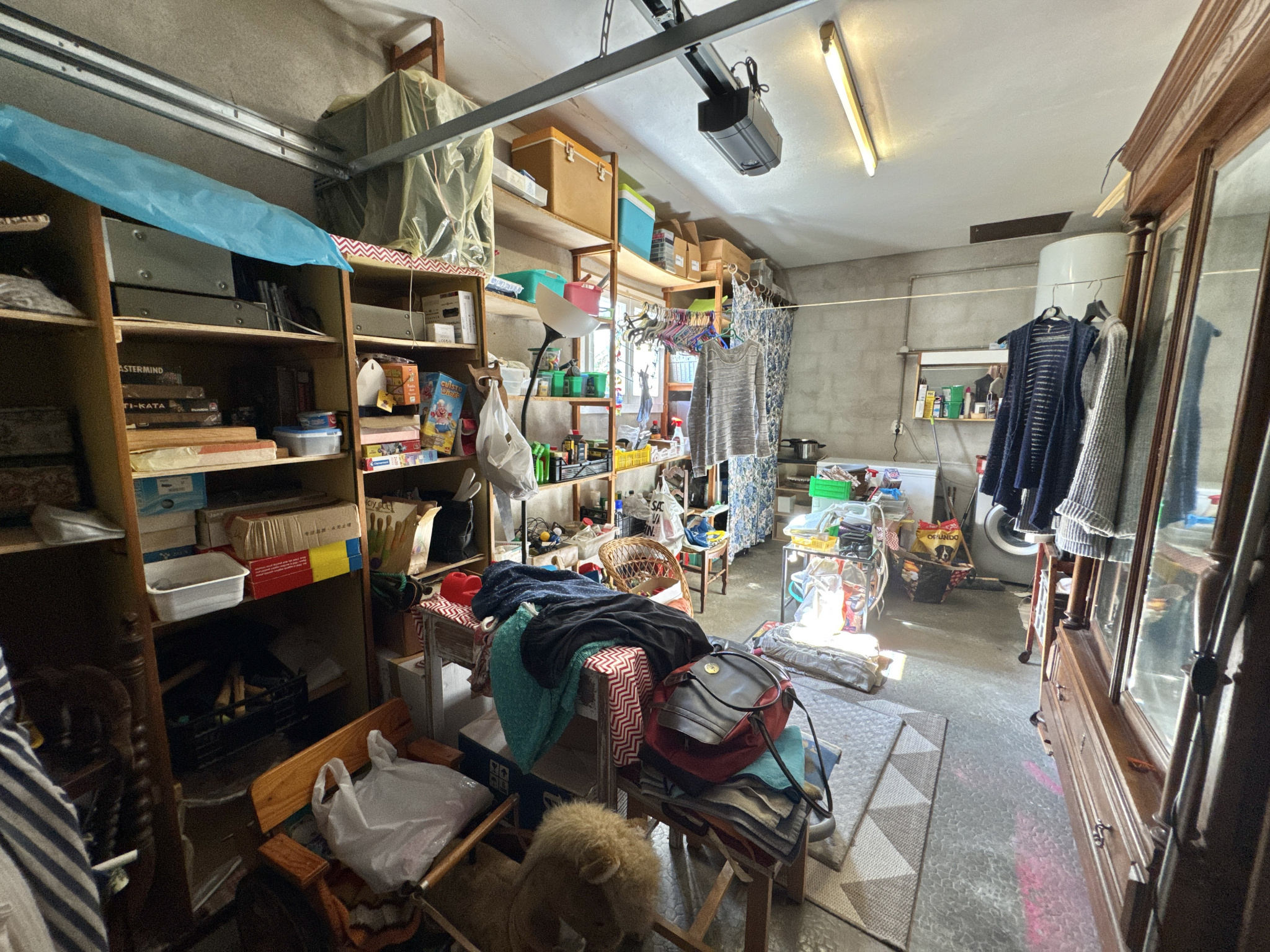 Une entrée directe sur salon avec cheminée insert bois et climatisation réversible, surface totale de 22,70 m², cuisine semi-ouverte de 12 m² donnant sur grand garage de 21 m² avec espace buanderie et porte électrique.
