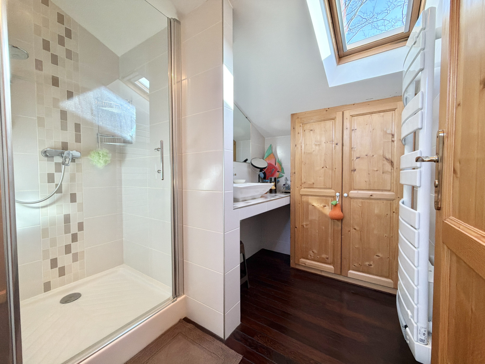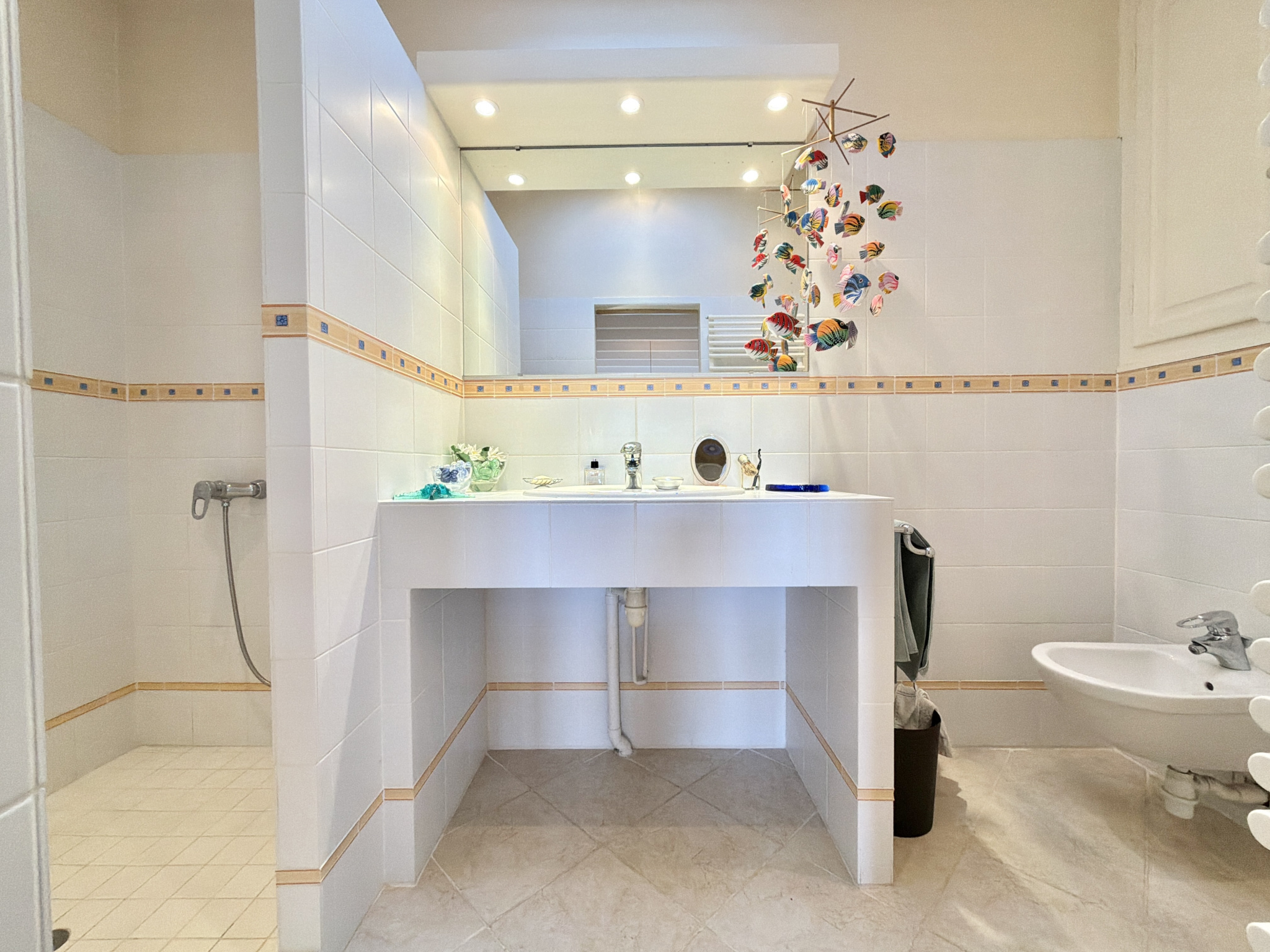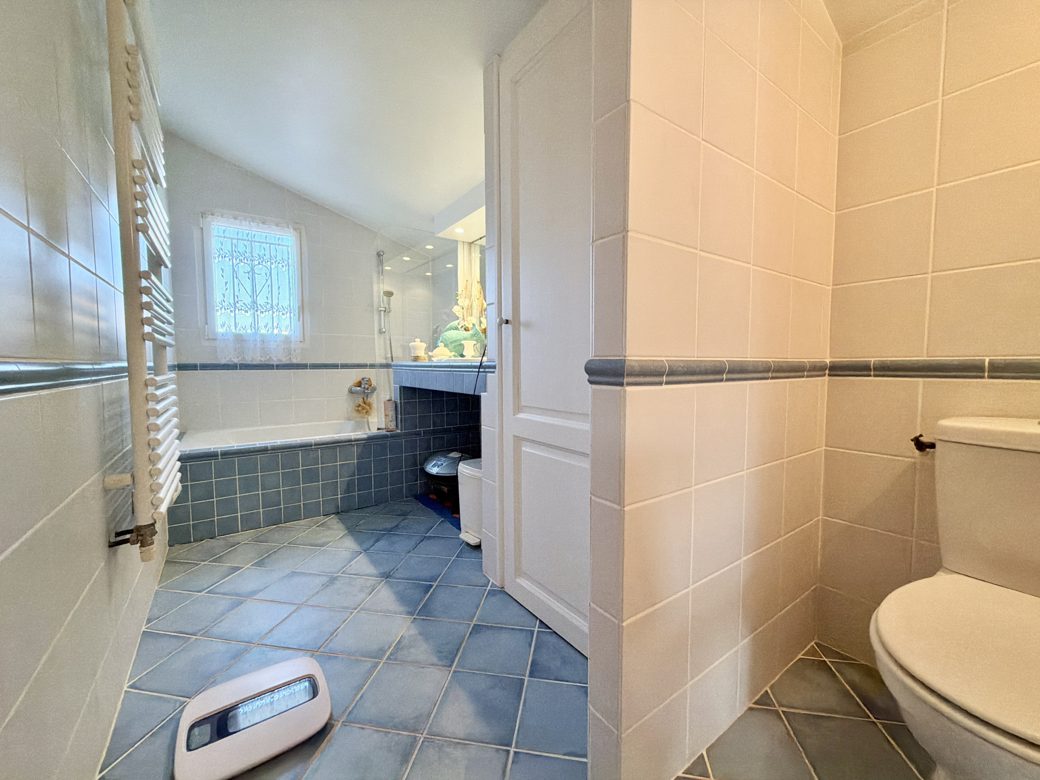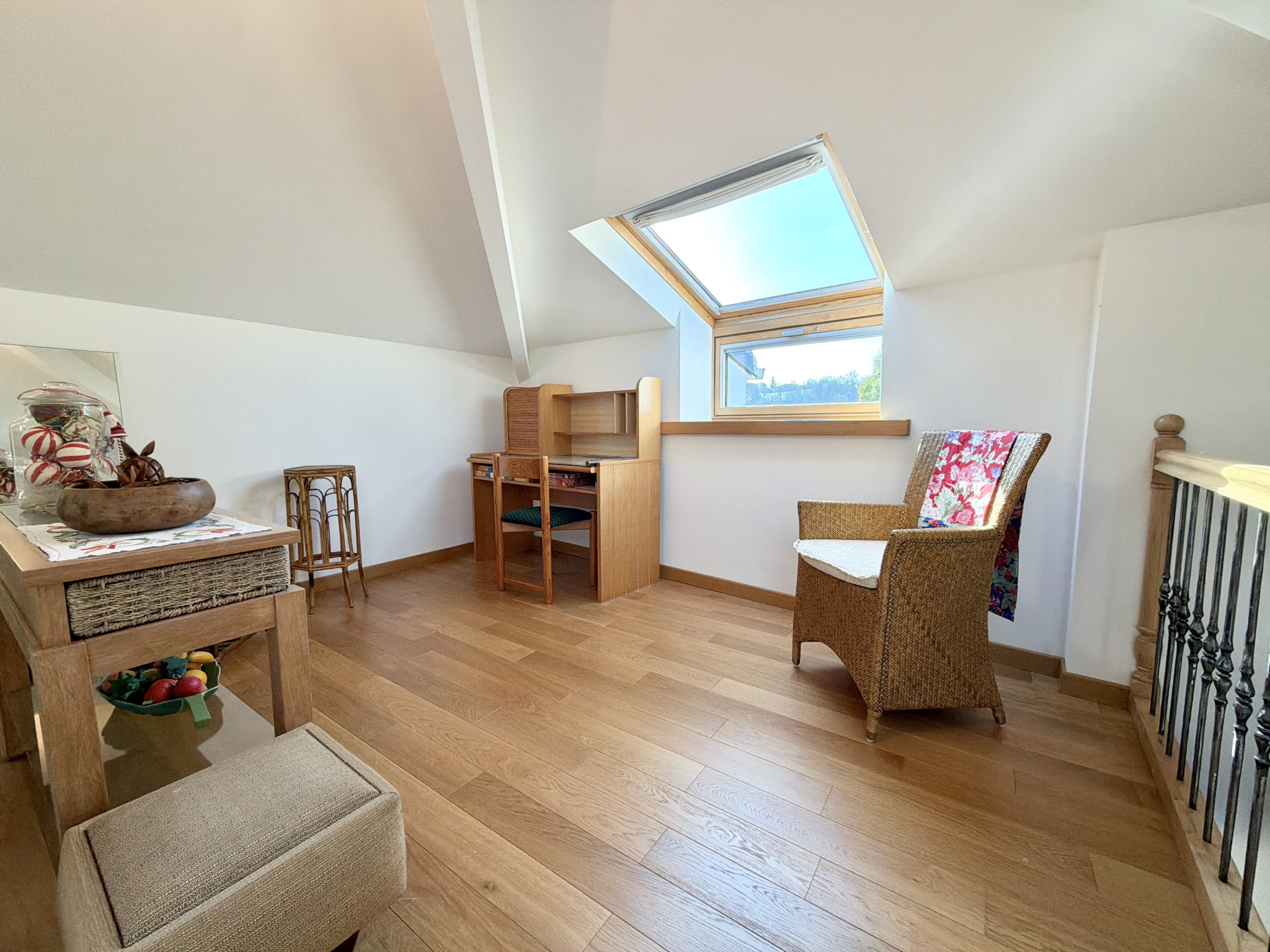 À l’étage, deux chambres supplémentaires : une première de 23,24 m² équipée d’une climatisation réversible, une seconde de 12,68 m², un espace mezzanine bureau de 12,42 m², salle de bain attenante de 7,30 m² avec baignoire, vasque et WC.