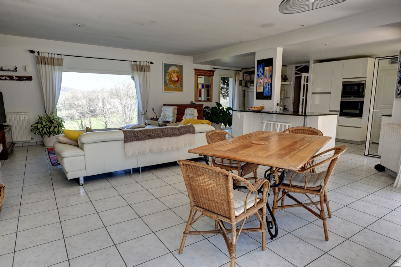 Entrée sur salon, séjour, cuisine ouverte américaine de 65 m² avec de grandes baies vitrées traversantes, baignée de lumière avec un joli insert à bois.