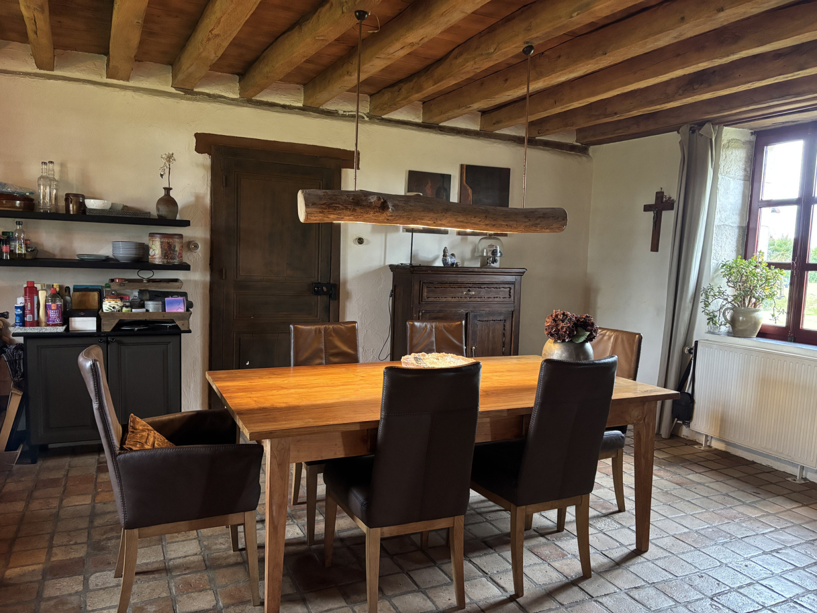À gauche du hall, vous entrez dans l'espace de vie spacieux, qui comprend une cuisine ouverte avec une plaque de cuisson au gaz, un four électrique encastré, un réfrigérateur encastré, un raccordement pour lave-vaisselle et une chaudière de cuisine électrique. Cet espace comprend également une salle à manger, un salon confortable avec un poêle à granulés et un espace pour un bureau. L'ensemble de l'espace de vie est équipé d'un chauffage au sol au gaz et se compose en partie de tommettes et de parquet authentiques.