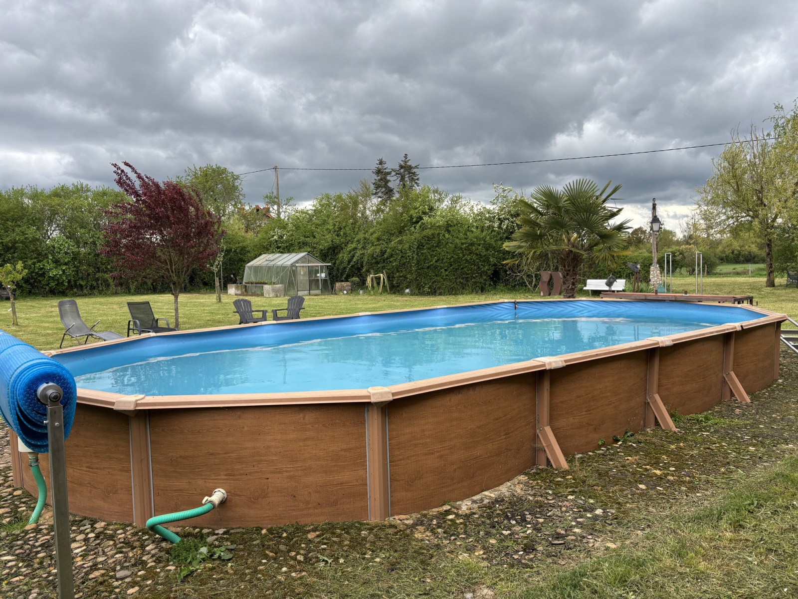 Derrière la grange se trouve une piscine semi-enterrée, chauffée par une pompe à chaleur. La piscine a été bien entretenue et est en bon état.