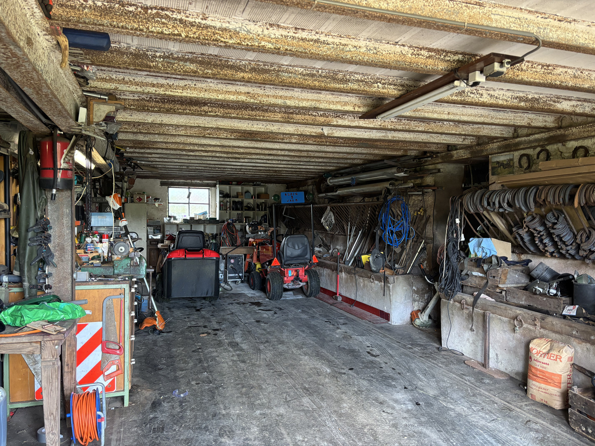La partie centrale de la grange est dotée de grandes portes et offre suffisamment d'espace pour garer une voiture. Sur la droite se trouve un autre espace de stockage avec des escaliers menant à une très grande pièce au premier étage.