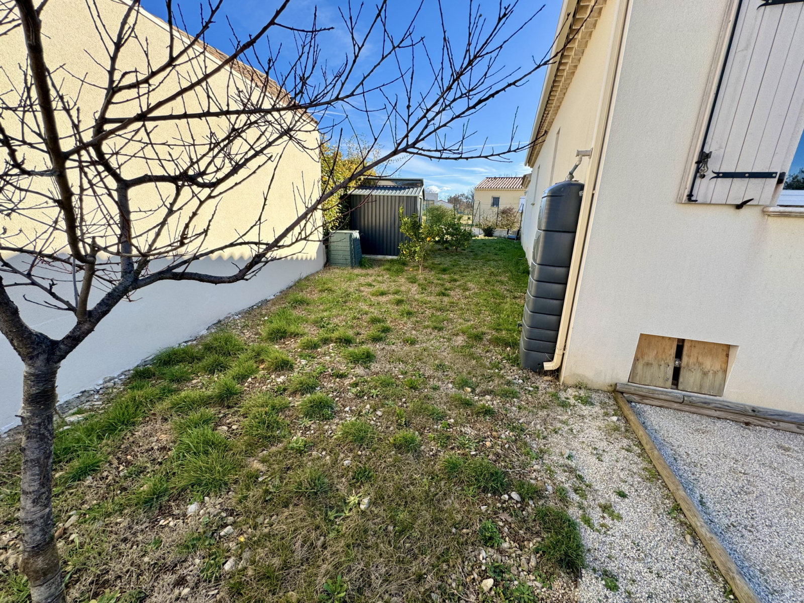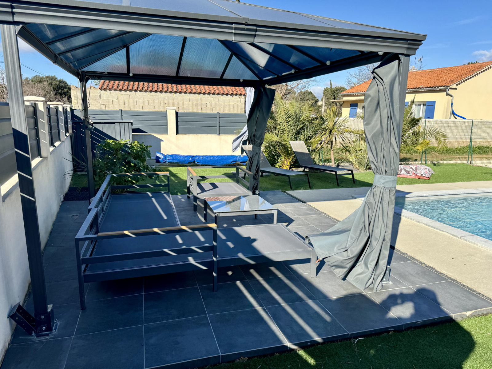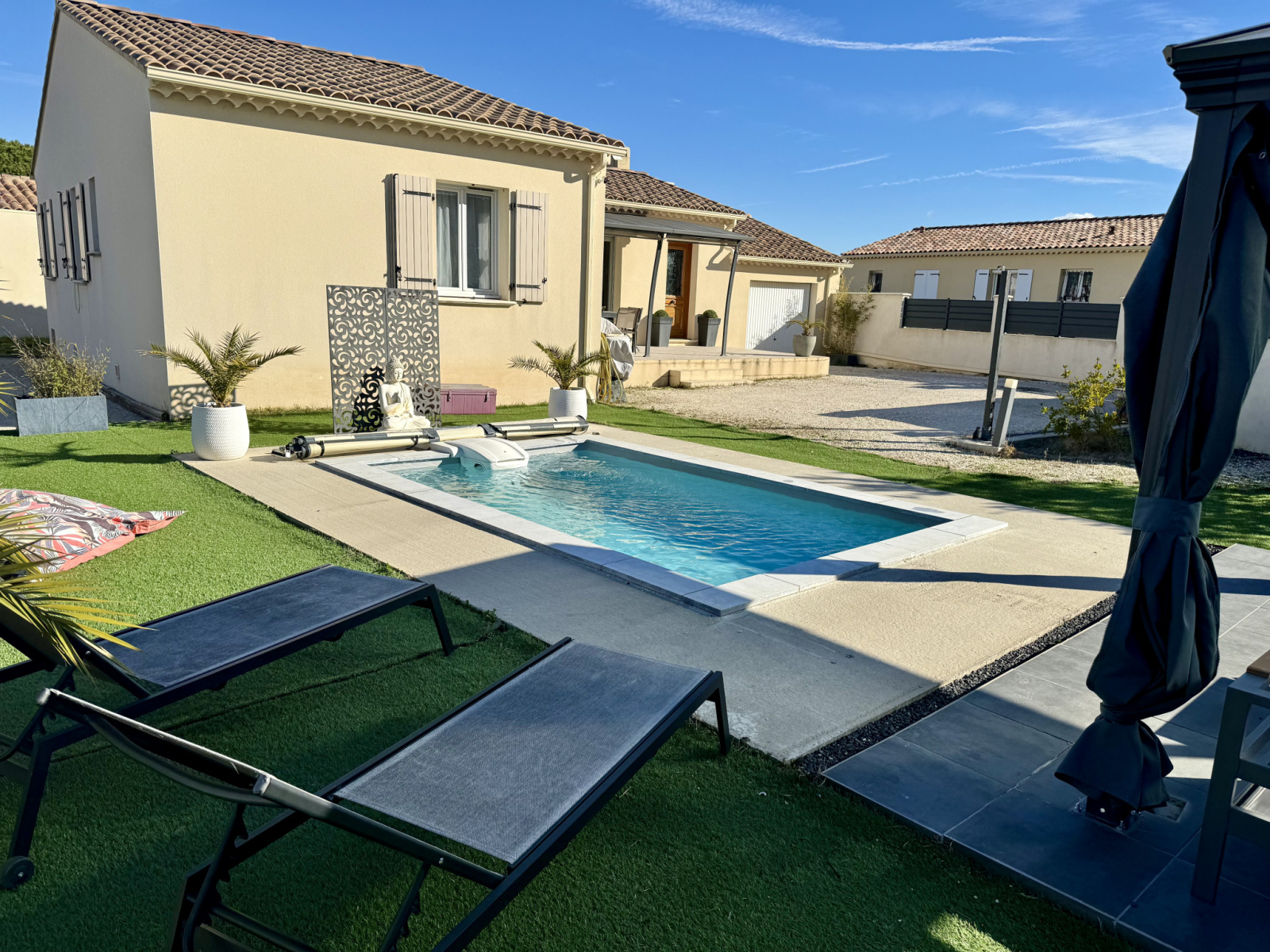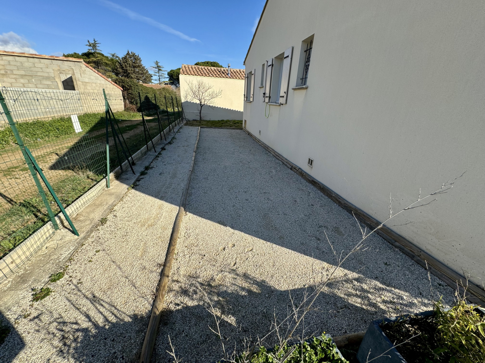 A l extérieure, vous disposerez au Sud d'une grande terrasse, d'une piscine de 4,5 X 2,5 m (filatration Desjoyaux), d'une Pergola, d'un espace pétanque et de la possibilité d'avoir un espace potager (partie Nord).