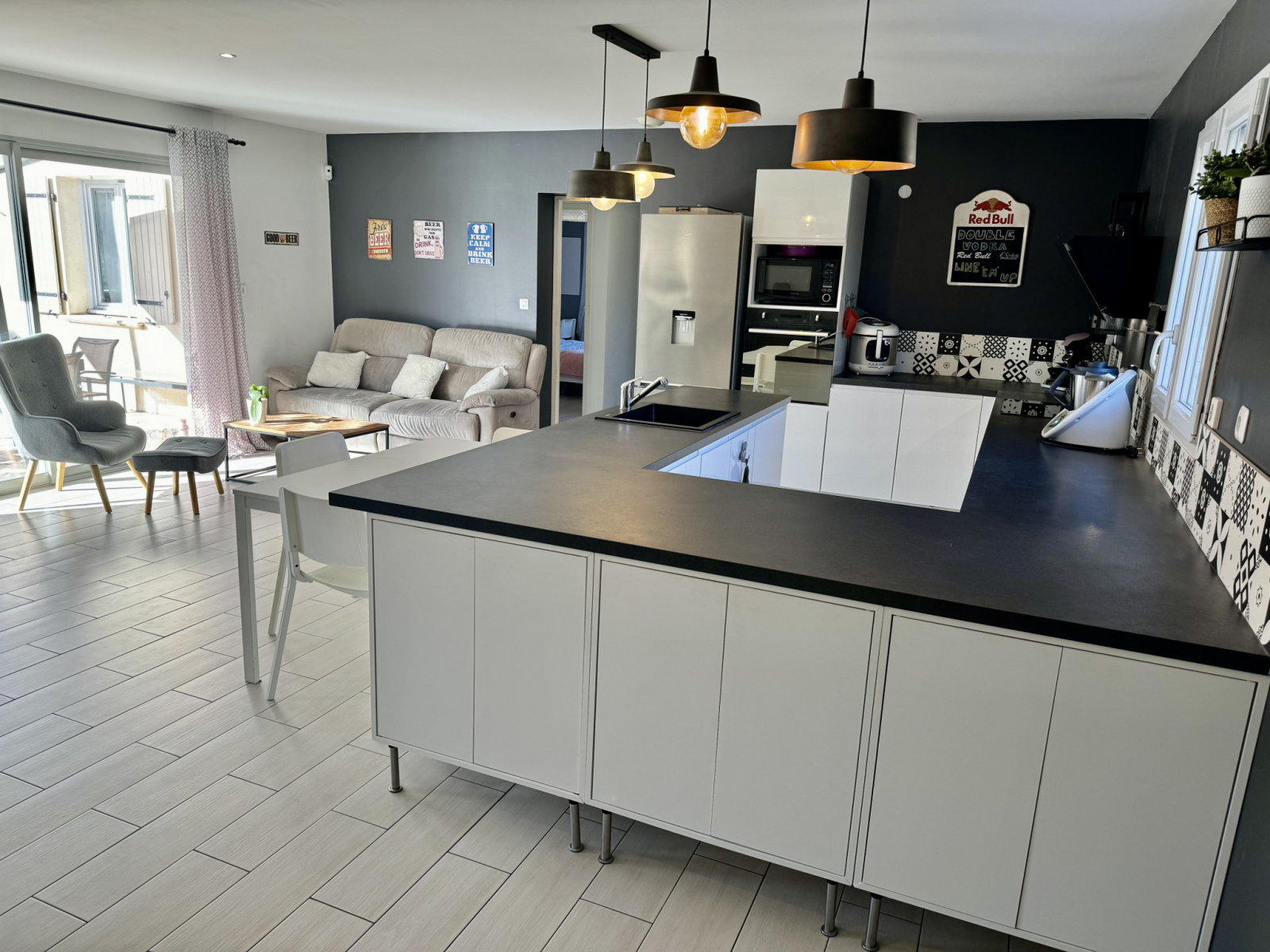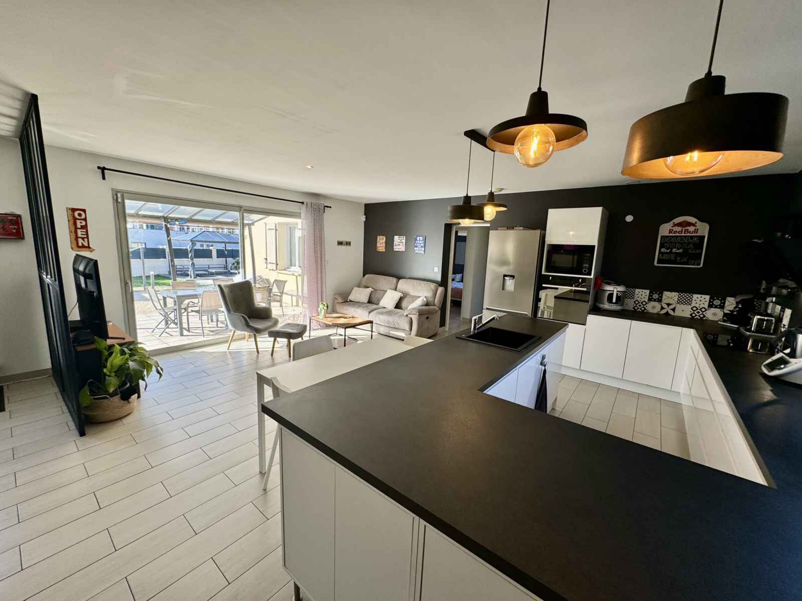 La maison de 2015 (normes RT2012), hors Lotissement, au calme, exposition plein sud, offre un beau volume sur la grande pièce de vie (45m2), sa cuisine aménagée-équipée ouverte sur tout l'espace de vie et la grande baie vitrée orientée Sud confère à l'ensemble une très belle lumoinosité.