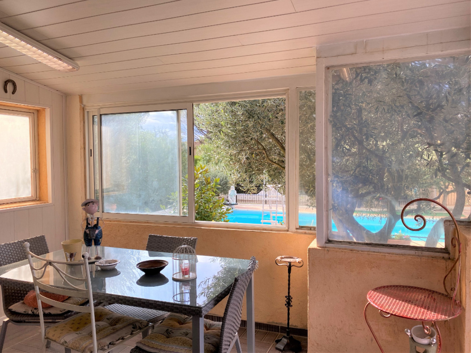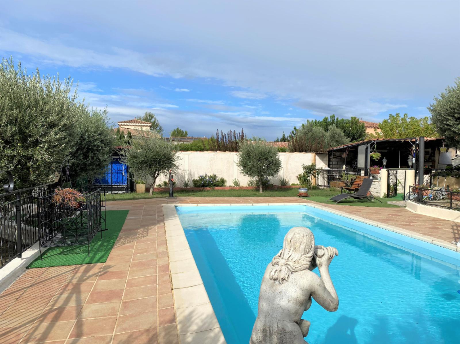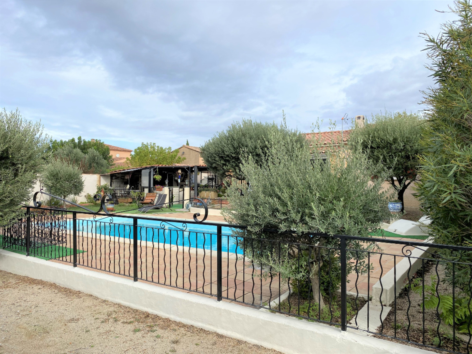 Camaret sur Aigues, dans un environnement privilégié et à proximité du centre du village, jolie maison de plain pied au calme et bien entretenue de 96 m² sur un terrain clos et arboré de 1050 m², avec piscine et atelier indépendant. La villa se compose d'un double séjour avec cheminée, d'une cuisine semi-ouverte, aménagée et équipée, ouvrant sur une véranda orientée Sud, 3 chambres, une salle d'eau spacieuse, et un garage communiquant avec la cuisine. La terrasse vous mènera au jardin et à la piscine (9x4). L'atelier indépendant d'une surface de 40 m² est accessible à la fois par le jardin et par un second portail à double battant, offrant une indépendance totale de cette partie de la propriété. Un second garage, indépendant, complète ces prestations, ainsi qu'une cuisine d'été et un forage. Cette propriété vous séduira par son caractère à la fois intime, familial et convivial. Proche de toutes commodités, et à 10 km des entrée/sortie de l'autoroute A7 et à 7 km de la gare d'Orange. Renseignements et visites Hélène ROBOREL de CLIMENS Agent Commercial Indépendant Tél 06.52.07.39.23 RSAC AVIGNON 853663797