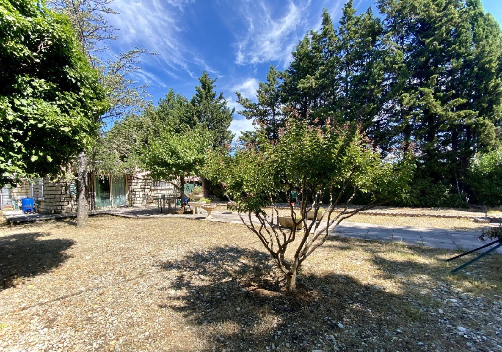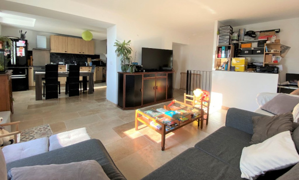 Sérignan du Comtat - Dans un environnement privilégié et à proximité du centre du village, jolie maison de plain pied de 120 m² sur un terrain en partie clos et arboré de 4000 m² environ, avec piscine et double garage attenant à la maison.
